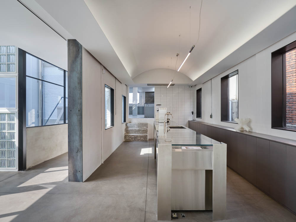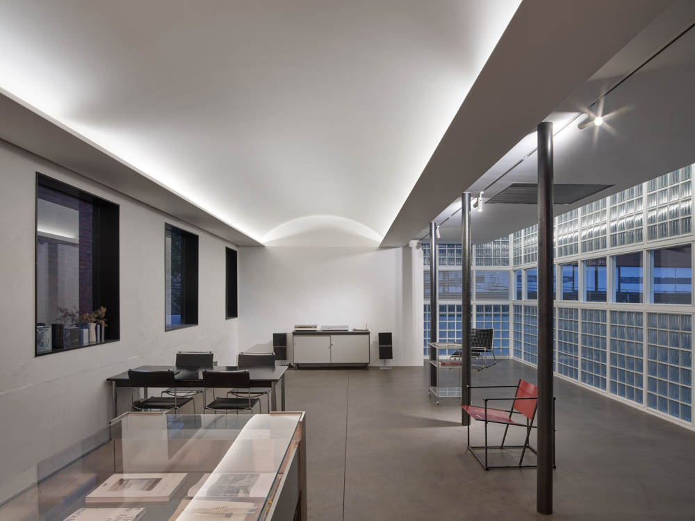 파사드 디자인과 함께 내부 조형에 의한 공간감을 잘 살려내는 것이 설계상 큰 도전과제 중 하나였다. 크지 않은 공간의 중앙을 가로지르고 있던 벽은 구조보강 후 최대한 허물었다. 벽이 아닌 기둥을 사이에 둔 평행하게 펼쳐진 두 공간을 좁고 긴 평면모양의 두 개의 다른 방으로 생각하고 형태를 잡았다. 유리블럭 파사드에 가까운 쪽의 방은 유리블럭의 효과를 극대화하기 위해 출입구 위치를 조정하고 파사드 쪽 천장을 최대한 들어올렸다. 출입구 위치 변경으로 출입 동선의 길이가 길어지면서 유리블럭의 공간으로 더 깊숙하게 빨려들어가는 효과를 기대했다.