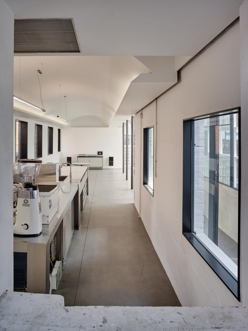 기둥 너머의 공간은, 지붕을 지탱하는 붉은색 각파이프 트러스를 남긴 채 분위기를 살릴 재간이 없어 각파이프를 모두 가리는 방향을 택했다. 형태적으로는 유리블럭을 통해 들어온 빛을 머금는 느낌을 상상하며 길고 긴 볼트 형태의 천장을 만들었다. 두 개의 방은 사이에 놓인 세 개의 원형기둥은 부담스럽지 않은 관문의 역할을 한다. 기둥을 경계로 달라지는 천장 모양에 의해 분위기가 전환된다.