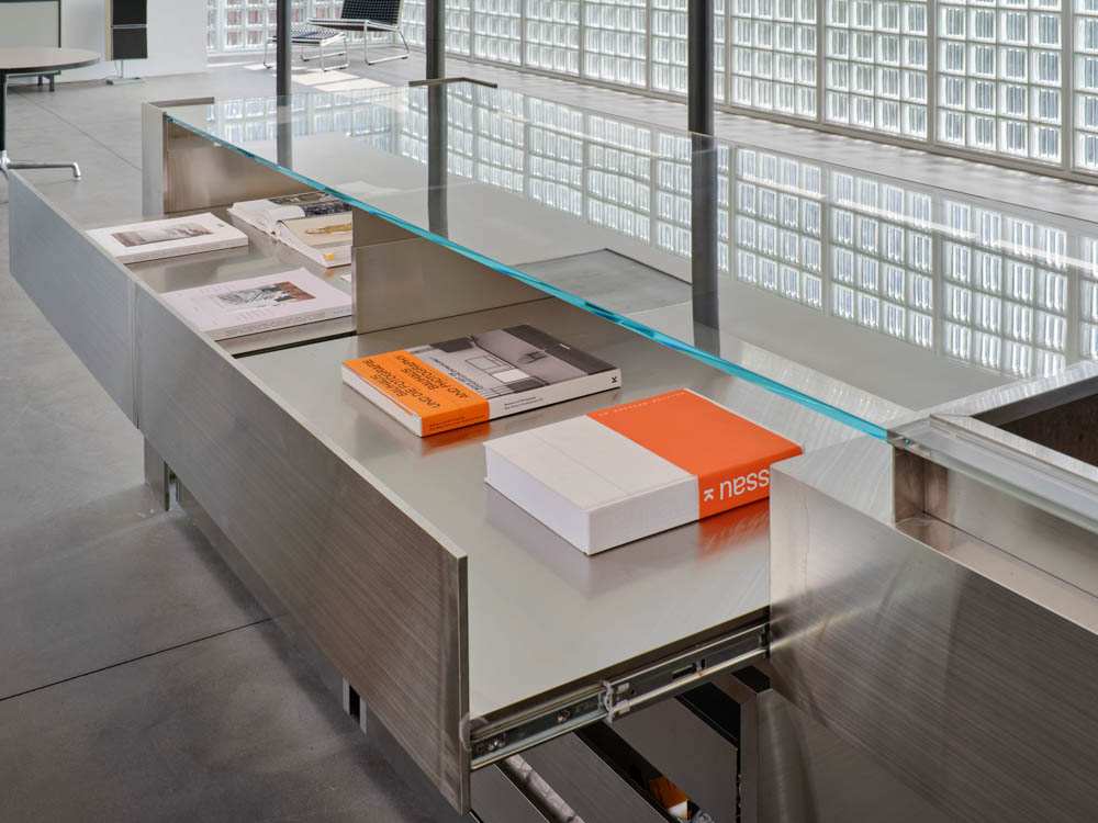 Along with the facade design, one of the biggest challenges was to create a sense of attractive space through ‘re-shaping’ the existing interior space elements. Prior to any decisions, we agreed to tear down the big wall that was crossing in the middle. For the change, we reinforced the structure with three parallel columns. Now we had two different rooms to design, running side by side. First step was to give the first room a better planar proportion and a dramatic glass block effect. For the purposes we moved the entrance point further outside and elevated the ceiling to the maximum height. Visitors were now expected to be drawn towards the light coming from deeper inside.