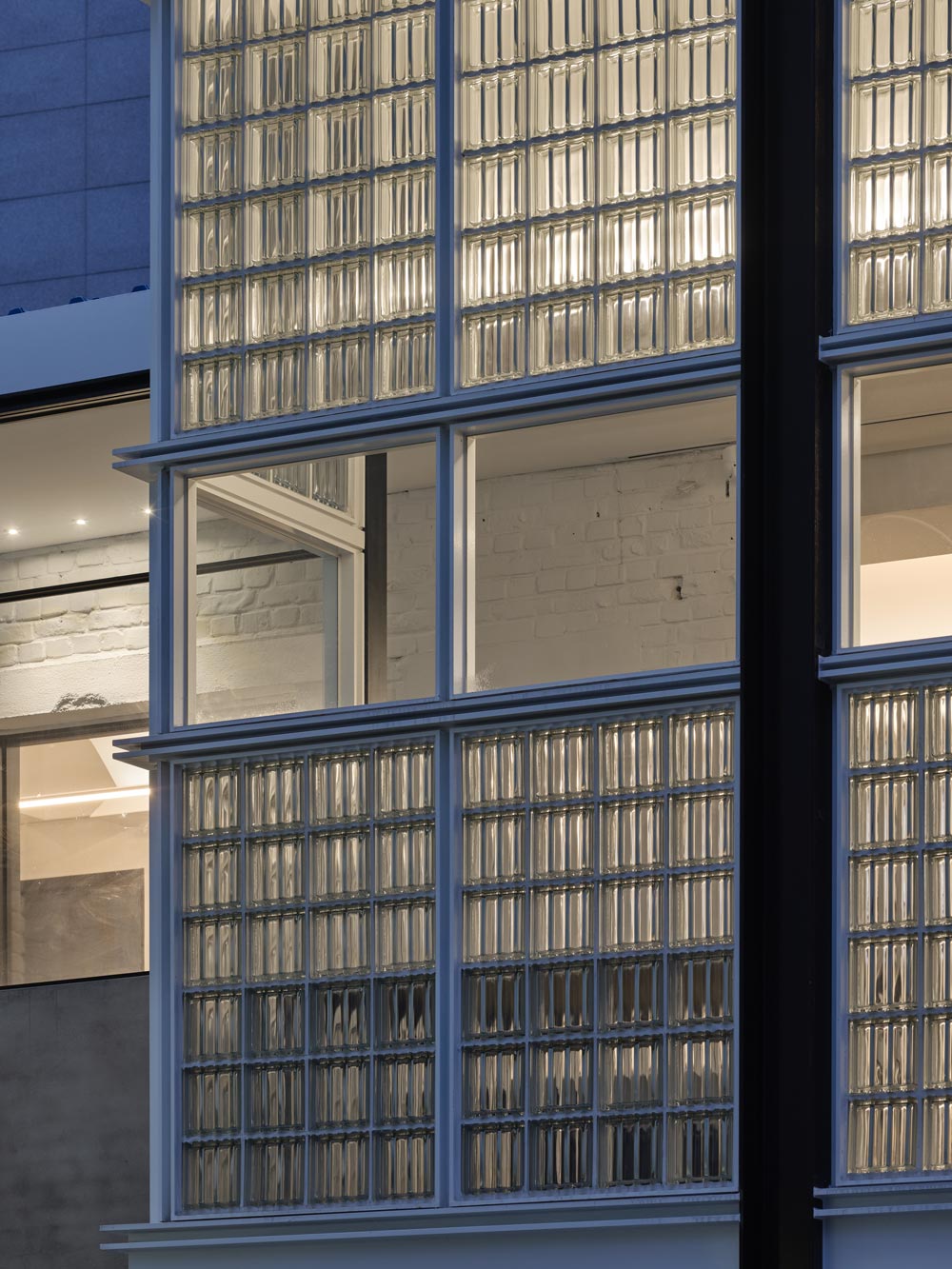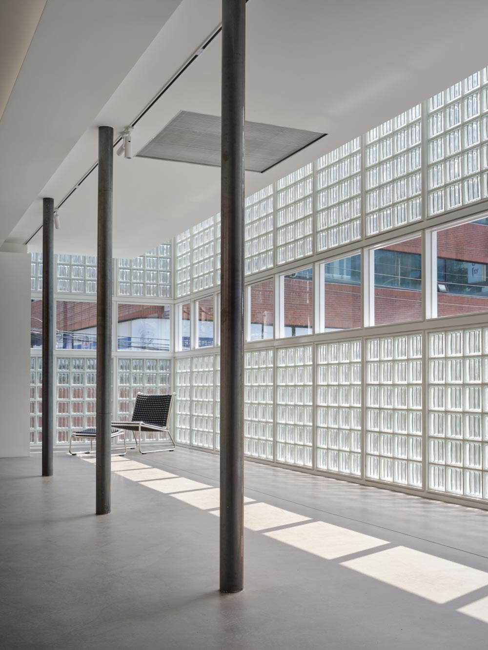 입면 재료에 유리블럭을 사용한 것은 의뢰인의 요청에 의한 선택이었다. 유리블럭과 금속 프레임의 조합을 생각하니 1930년대 파리에 지어진 유명한 작품1)이 떠올랐다. 감각에 의해 프레임을 나누기보다는 재료의 물성, 채광과 조망에 대한 필요에 의해 면을 분할하고 그 사이를 유리블럭으로 채우는 방식으로 입면을 구성했다. 4x6 모듈의 유리블럭 묶음과 기성재료를 최대한 활용한 금속 프레임이 반복적인 시공과정을 통해 10m의 긴 입면을 완성하는 논리이다. 금속 프레임은 모듈을 규정하는 보조장치임과 동시에 벽 전체를 지탱하는 골격의 역할을 한다. 골격이 있으니, 추후 유리블럭이 아닌 다른 재료로 벽을 교체하는 상상도 해볼 수 있다.
