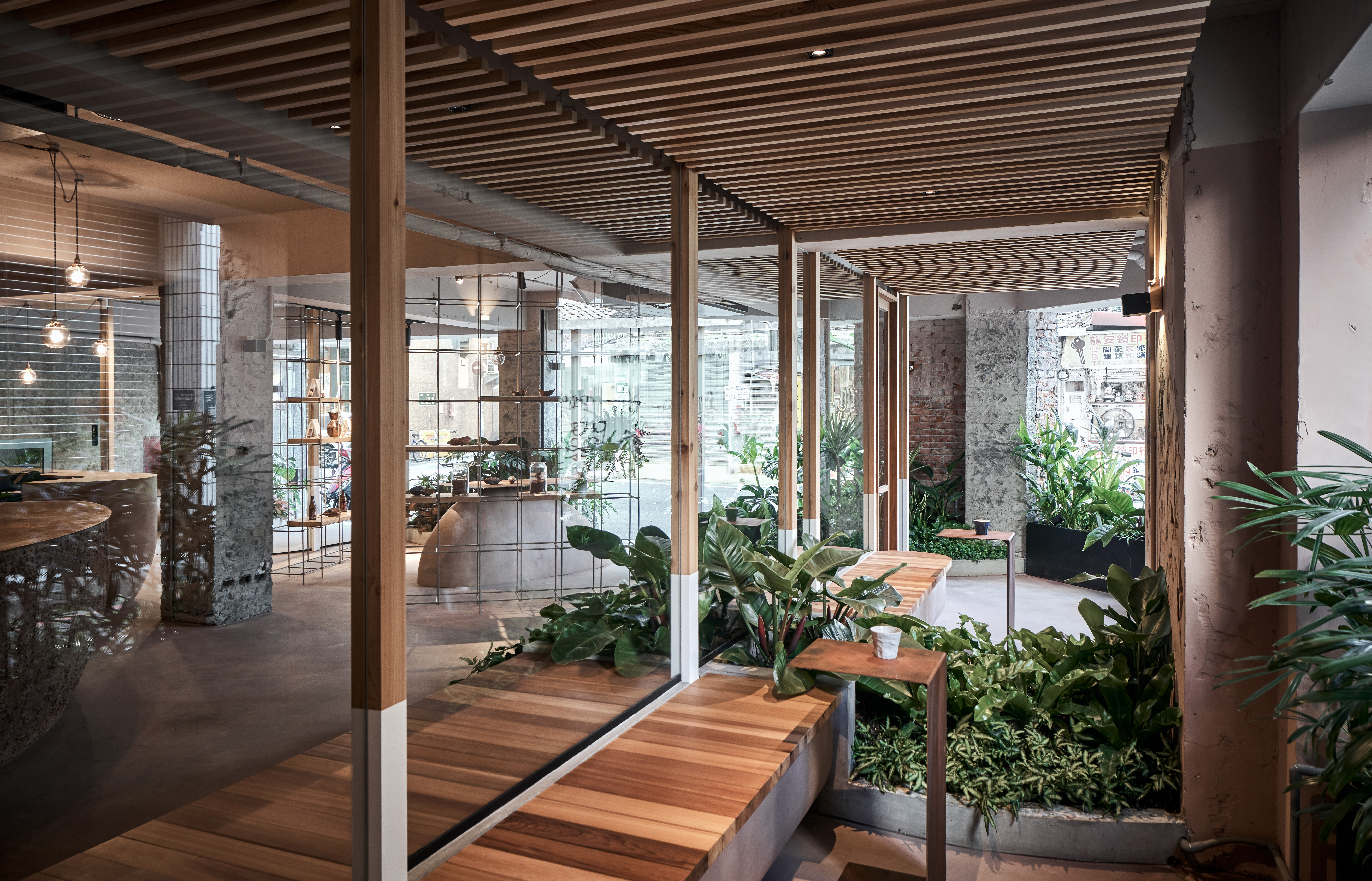 First, we recessed the original indoor area by 1.5 to 2 meters, piled up mounds, planted plants, and used soft design techniques to create a garden-like space on the ground floor of the old apartment. We intend to reshape the image of the corner space and be friendlier to the community. By adding more greenery and landscape, and even leaving the front yard entry for community residents to stop and rest, this allows the new brand to commingle with the community through an inviting image and spatial style, giving the commercial space a much warmer sense of community and locality. (Let the commercial space be more integrated into the local community)