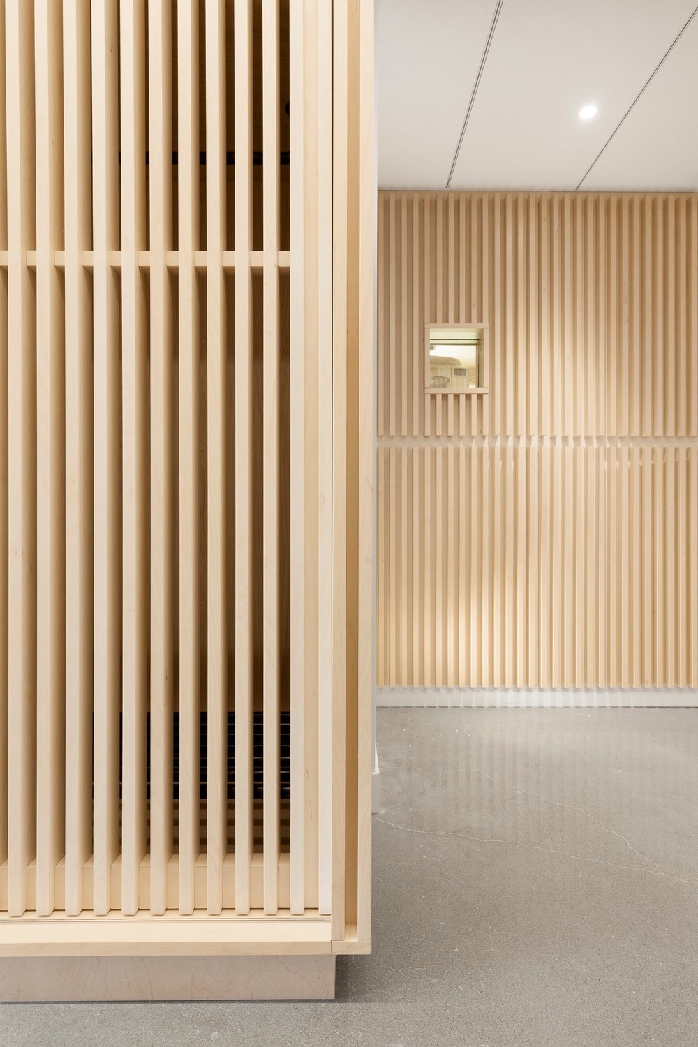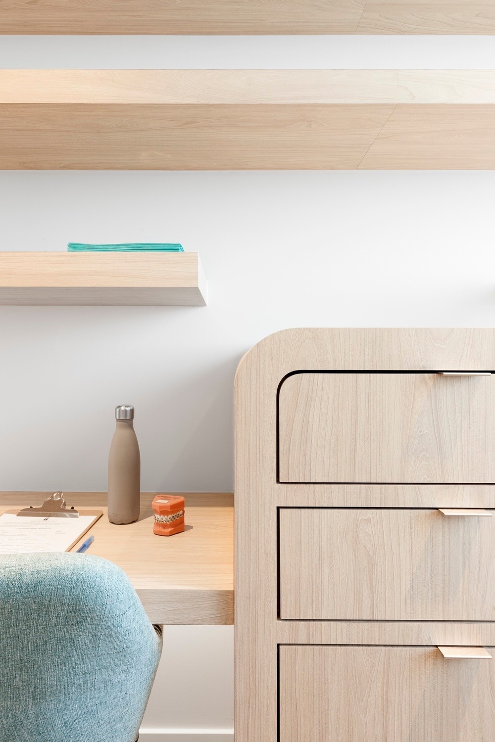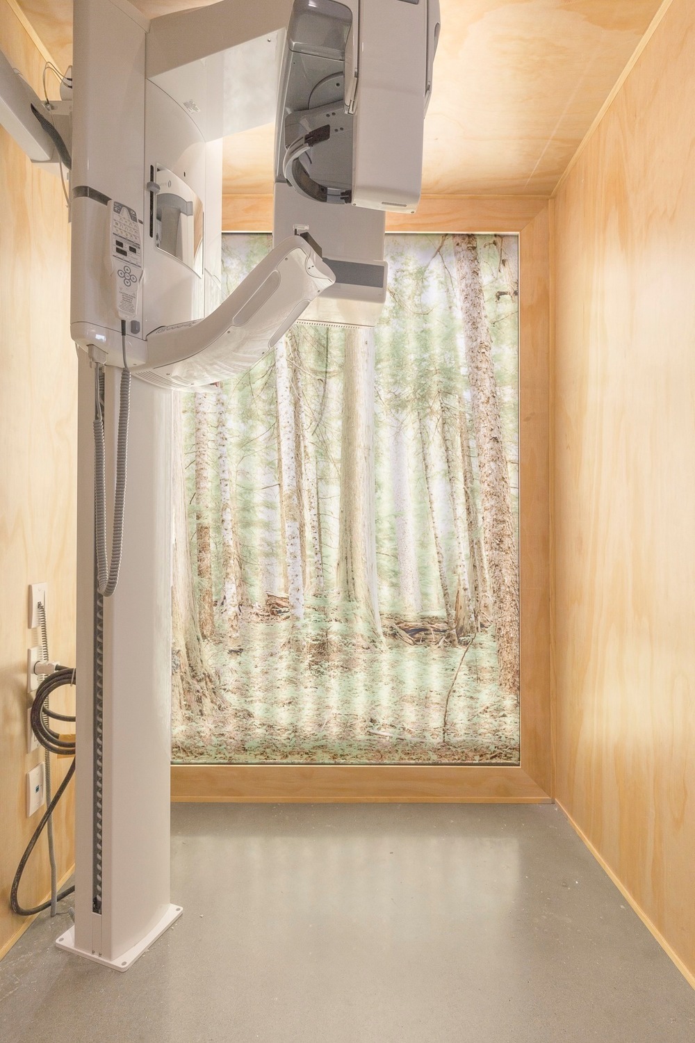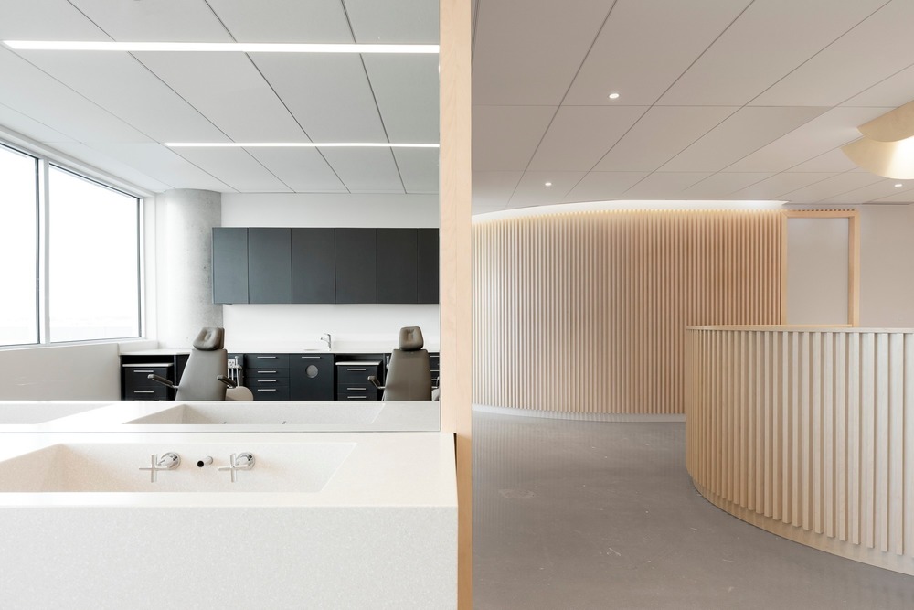 클리닉에서는 불안감이 종종 나타나기 때문에 방문자 경험에 대한 민감도가 필수적이다. 치과 진료실에서 가장 두려운 경험과 관련된 영역은 엑스레이실이다. 이 작은 공간의 모든 내부 표면은 폐쇄 공포증으로 느껴질 수 있는 환경에서 응집력 있는 느낌을 주기 위해 전나무로 마감됐다. 목재로 된 공간에 배치되면 X선 기계는 컨텍스트에 따라 덜 무섭고 덜 기계처럼 보이게 된다. 이 클리닉의 대기실 공간은 자연광과 벽걸이형 벤치로 이루어져 있으며, 등받이가 낮아 좁은 공간에서 공간을 최대한 활용할 수 있다. 또한, 등이 입구 쪽으로 향하는 좌석이 없어 불안감을 덜어준다. 낮은 테이블이 길게 겹치면 사용자 맞춤형 구성이 가능하며, 더 많은 공간을 만들기 위해 다른 테이블 아래로 밀어 넣을 수 있다. 나무의 새틴 마감은 자연광을 잡아주고 LED 언더라이팅을 통해 벤치의 기하학적 구조에 입체감을 준다. 이 대기실의 벤치와 테이블에 사용된 목재는 클리닉의 모든 목재 표면에서 볼 수 있는 밝은 톤으로 염색된 러시아 합판이다. 이 유형의 나무는 강성과 뒤틀림에 대한 저항성을 위해 사용됐다.