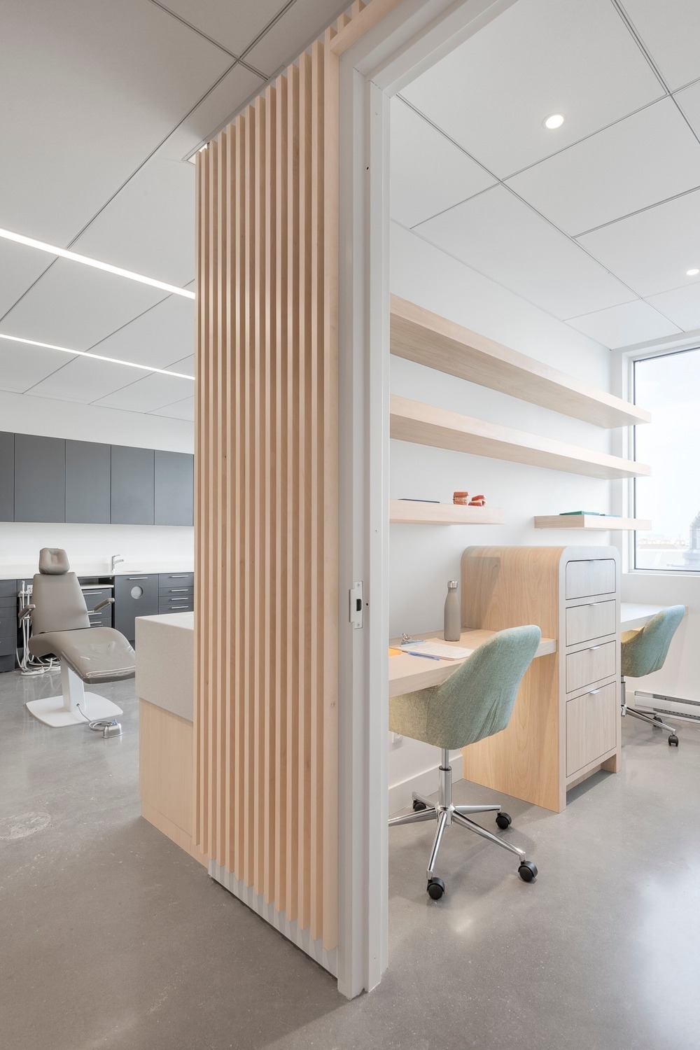 클리닉에서는 불안감이 종종 나타나기 때문에 방문자 경험에 대한 민감도가 필수적이다. 치과 진료실에서 가장 두려운 경험과 관련된 영역은 엑스레이실이다. 이 작은 공간의 모든 내부 표면은 폐쇄 공포증으로 느껴질 수 있는 환경에서 응집력 있는 느낌을 주기 위해 전나무로 마감됐다. 목재로 된 공간에 배치되면 X선 기계는 컨텍스트에 따라 덜 무섭고 덜 기계처럼 보이게 된다. 이 클리닉의 대기실 공간은 자연광과 벽걸이형 벤치로 이루어져 있으며, 등받이가 낮아 좁은 공간에서 공간을 최대한 활용할 수 있다. 또한, 등이 입구 쪽으로 향하는 좌석이 없어 불안감을 덜어준다. 낮은 테이블이 길게 겹치면 사용자 맞춤형 구성이 가능하며,  더 많은 공간을 만들기 위해 다른 테이블 아래로 밀어 넣을 수 있다. 나무의 새틴 마감은 자연광을 잡아주고 LED 언더라이팅을 통해 벤치의 기하학적 구조에 입체감을 준다. 이 대기실의 벤치와 테이블에 사용된 목재는 클리닉의 모든 목재 표면에서 볼 수 있는 밝은 톤으로 염색된 러시아 합판이다. 이 유형의 나무는 강성과 뒤틀림에 대한 저항성을 위해 사용됐다.