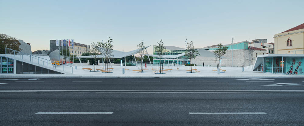 The design consists of an underground and an above-ground part integrated by a modern interpretation in the traditional Mediterranean and industrial materials. The structure of the canopy, pre-manufactured in the Split shipyard, was designed to run an active formal dialogue with the modernist library buildings. The flexibly organized infrastructural field visible in the square area, composed of connection points /urban box elements/ for the reception of urban fixtures, allows for easy creation of various event scenarios and artistic performances.