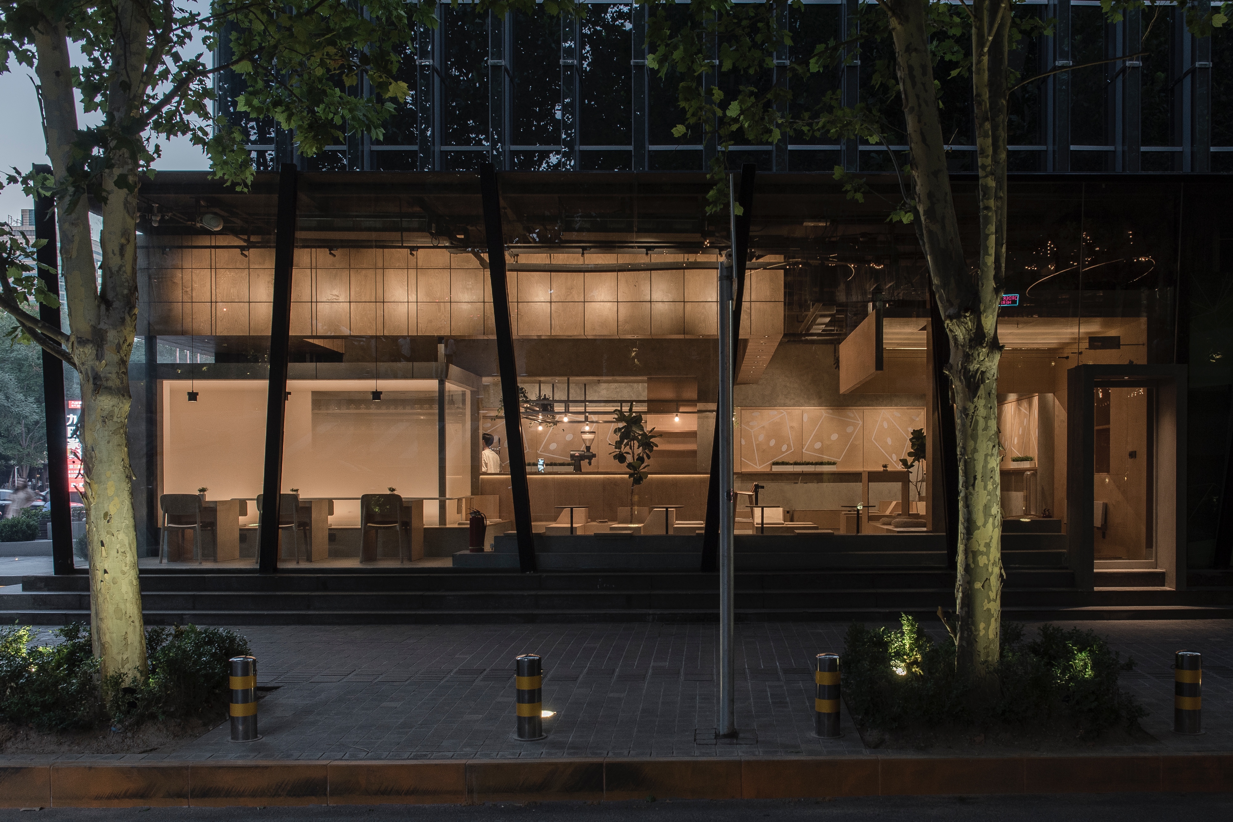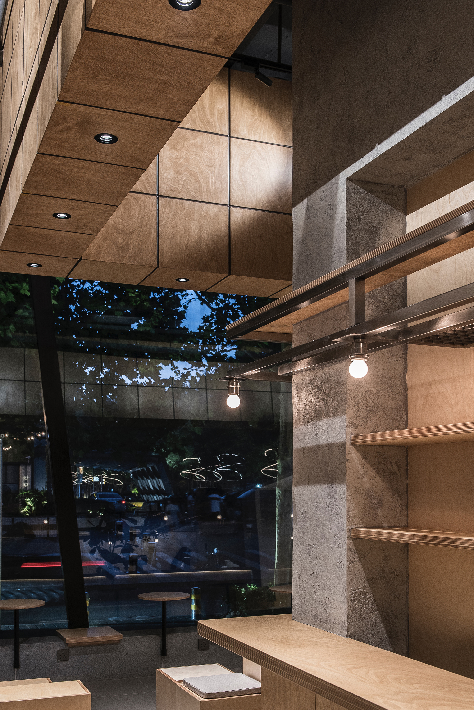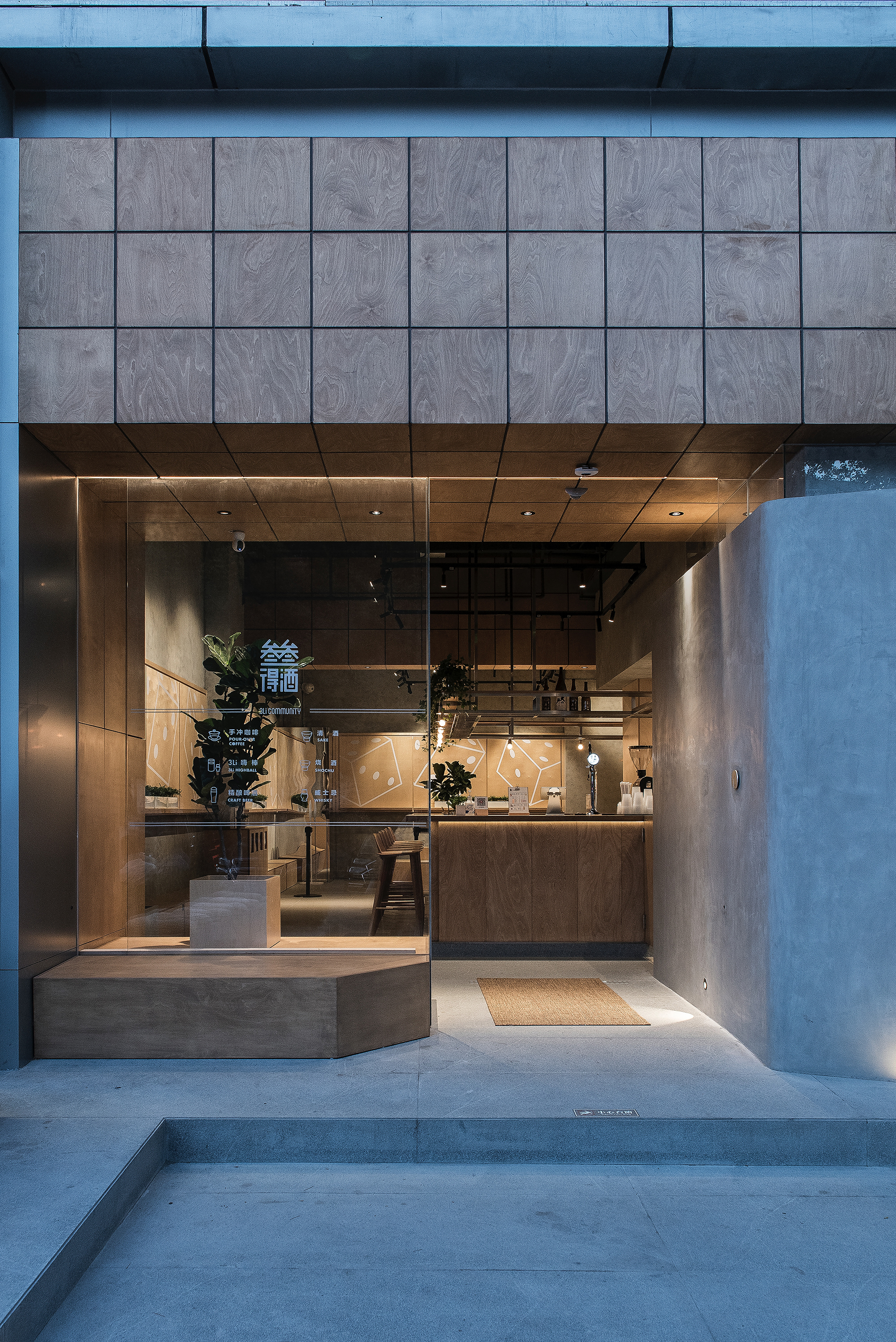 The brand image of San San De Jiu is targeted at leaving the message of emphasis on the simplicity and clearness of their drinks. Therefore, our strategy for the design was allocated with the same tone. Since the facade of the area is mostly transparent, we used the warm-colour wood as the main material to set a clear focus on the sights. The U-shaped ceiling extending from the inside to the outside is composed of grid modules, and the natural texture of the birch wood grain is just right to present the gentle streamlines. The entrance used a two-way inclined design to break the regular façade while introducing people to the indoor area.