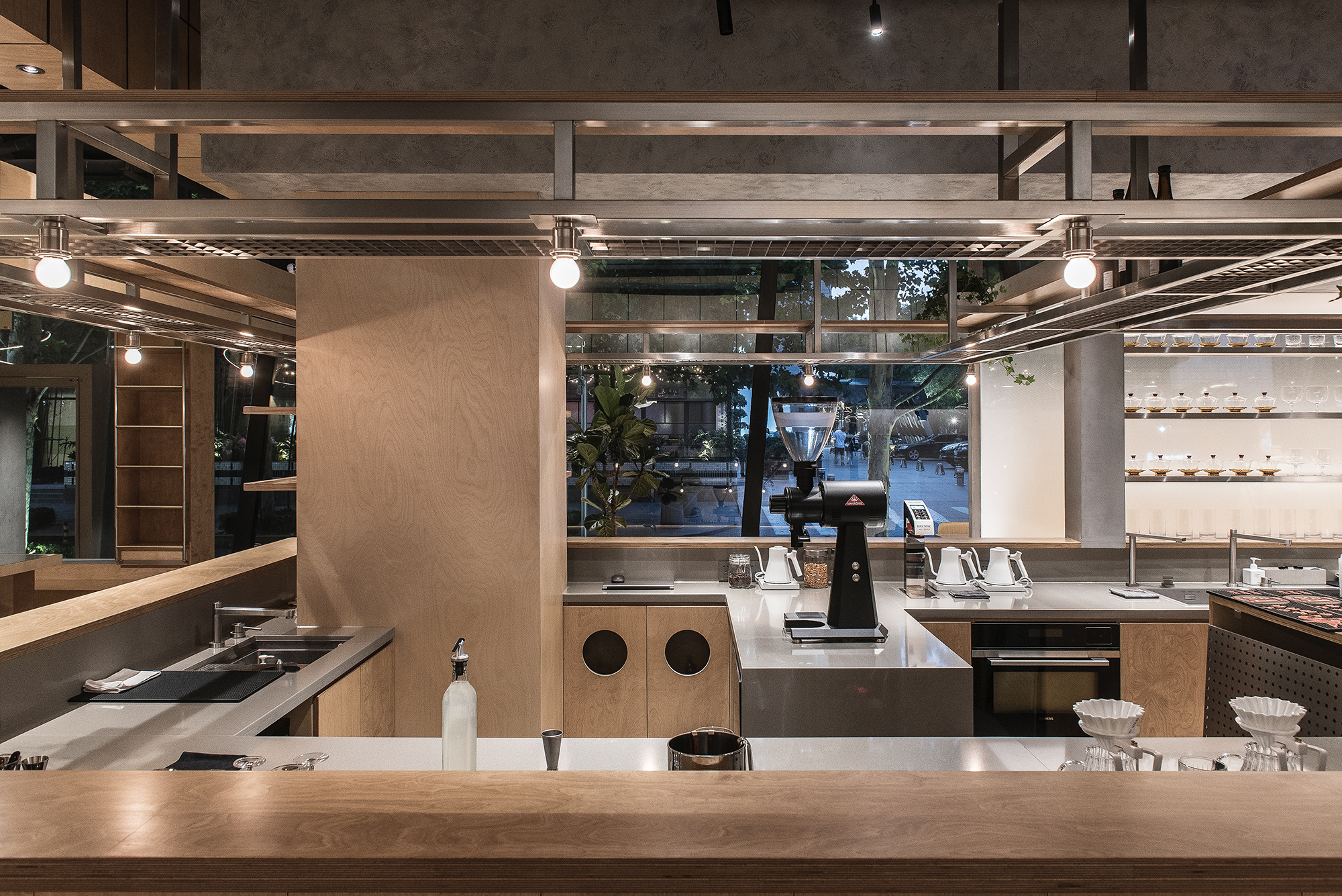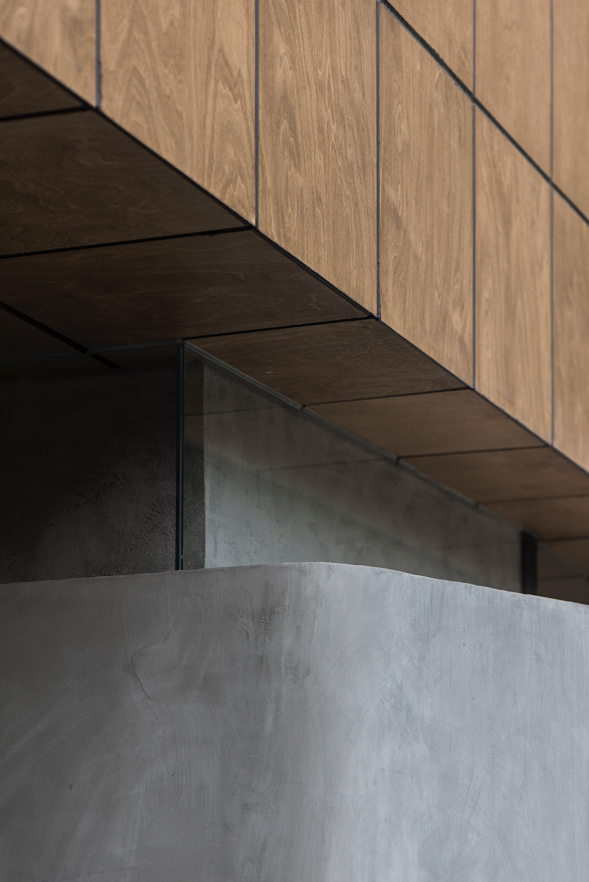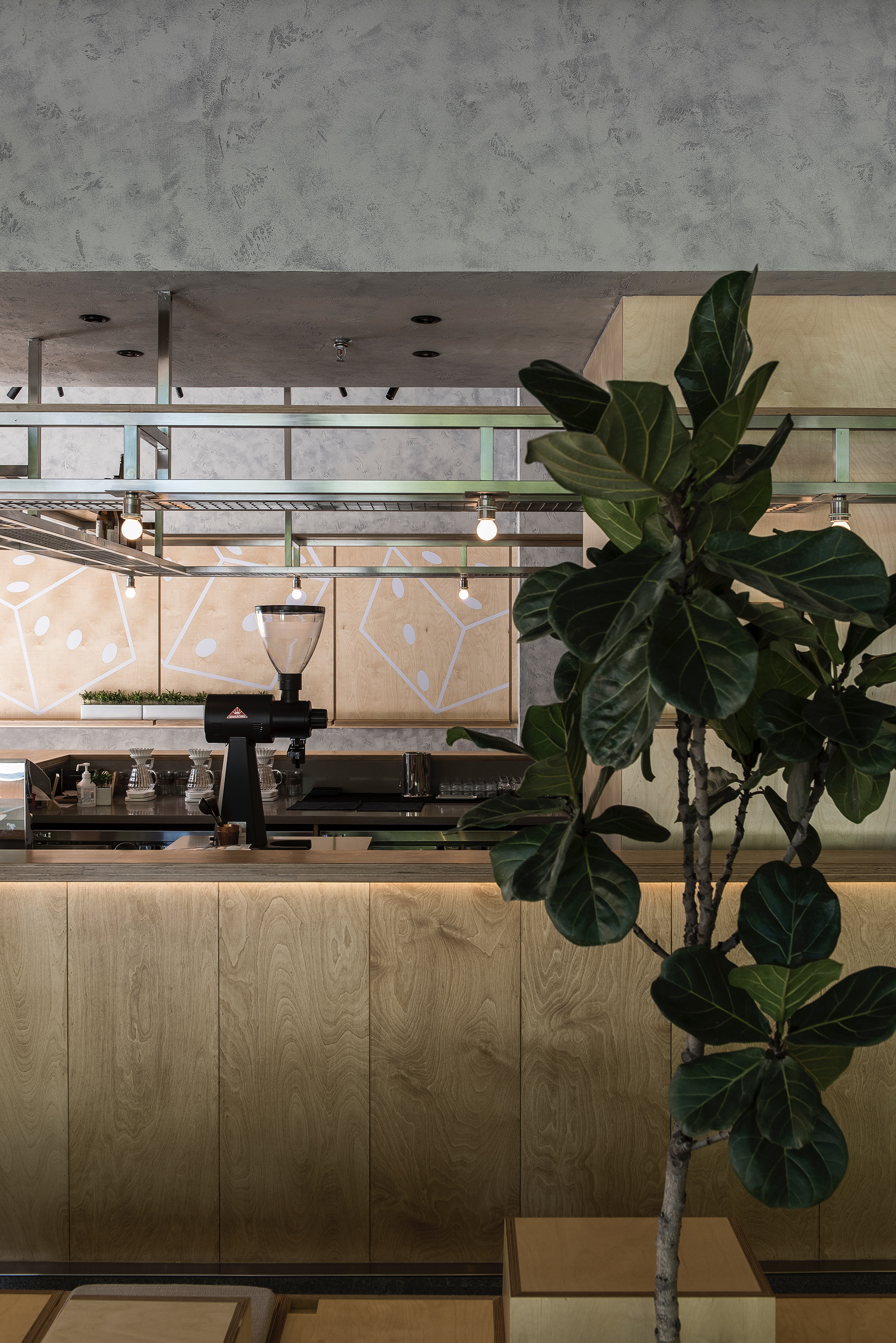 The brand image of San San De Jiu is targeted at leaving the message of emphasis on the simplicity and clearness of their drinks. Therefore, our strategy for the design was allocated with the same tone. Since the facade of the area is mostly transparent, we used the warm-colour wood as the main material to set a clear focus on the sights. The U-shaped ceiling extending from the inside to the outside is composed of grid modules, and the natural texture of the birch wood grain is just right to present the gentle streamlines. The entrance used a two-way inclined design to break the regular façade while introducing people to the indoor area.