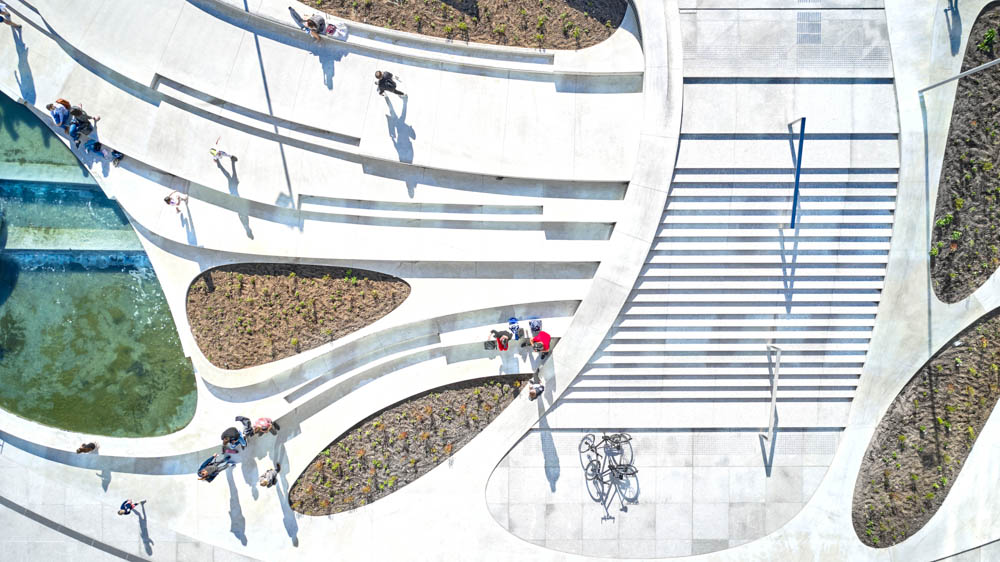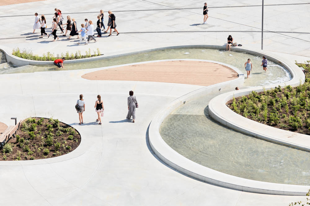 A historical square is transformed: the designer initially developed two design levels that structure the entire surface as a grid made up of visible lines on the ground. One is linear and forms the historical context, in which the existing axes of vision and movement are taken into account. The other level is designed to be organic and fluid, reflecting the natural flows of movement of passers-by. What was previously a largely unused space adjoined by historical buildings is now becoming a new, inviting public amenity where you can casually enjoy a coffee in your lunch break or get some work done outdoors while children play in the water, young people skate and students relax in the sun. This is certainly the new now in Kaunas, a city in Lithuania which, with the help of the designer, has brought to life a future-oriented architectural concept that sets new impulses and is geared towards the communicative needs of a young and dynamic generation. The history-steeped “Unity Square” with its impressive buildings from different eras has been redesigned to reflect the innovative spirit of a country considered to be a pioneer of digitization.