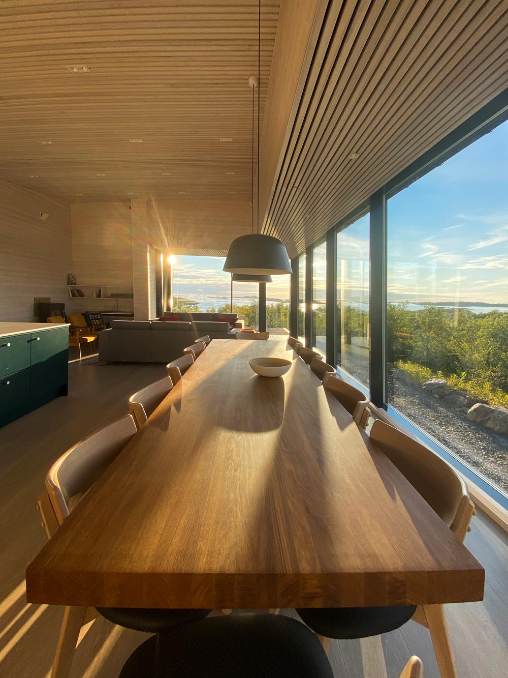 Inside the cabin, the walls are covered with pine boards, oak floors, and a 45x45 wooden slated ceiling. This creates a warm and cozy atmosphere to relax by the fireplace. At the dinner table, one gathers the family with a panoramic view of the mountains. The lines between inside and outside have been blurred and the space changes in tune with the light and landscape.