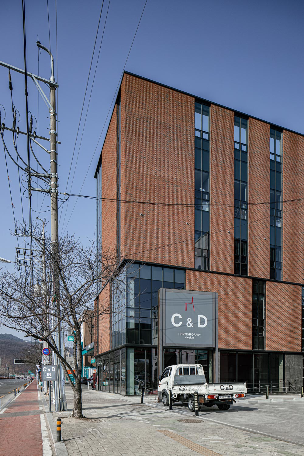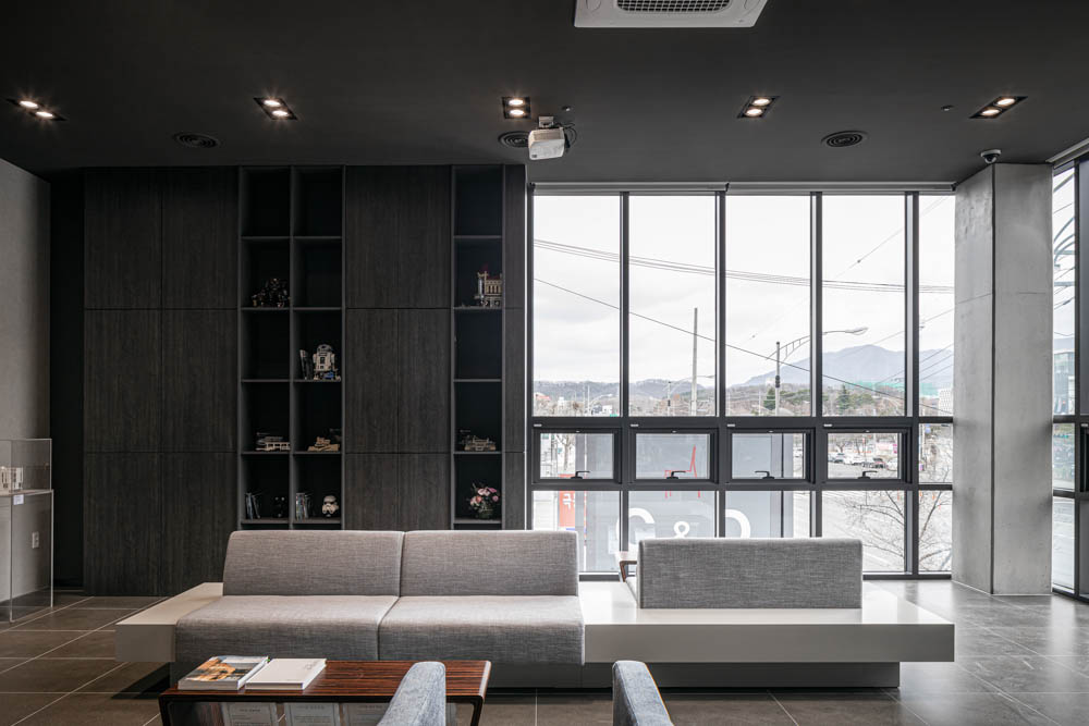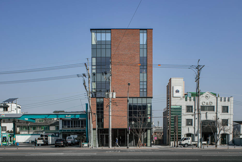Due to the limitation in number of floors and floor area ratio, there were concerns about the space composition as all the legal areas were occupied by the required areas, but the exterior material was the biggest concern of all. Red brick was chosen as the exterior material, of which the solid and heavy texture goes well with the surroundings, but its weight gives a sort of credibility. The façade of the brick mass was divided through the division of openings. This façade has a modern sense of simplicity, and the perfect mixture of metal materials make it seem as if the bricks were put together by a machine.