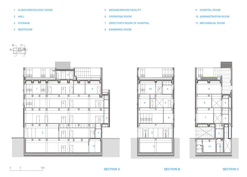Although it is located along the road, it consists of four stories above ground and one basement level as it is a class 1 general residential area. Looking at the composition of each floor, except for some shops for lease, the first basement floor is used as a seminar space, the first floor shops for lease and a hall space, the second floor medical and examination rooms, the third-floor in-patient rooms, and the fourth-floor surgery and administrative support rooms. There is a garden on the roof.