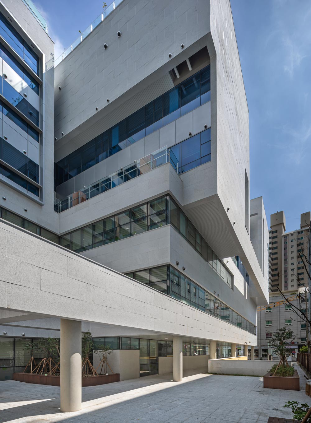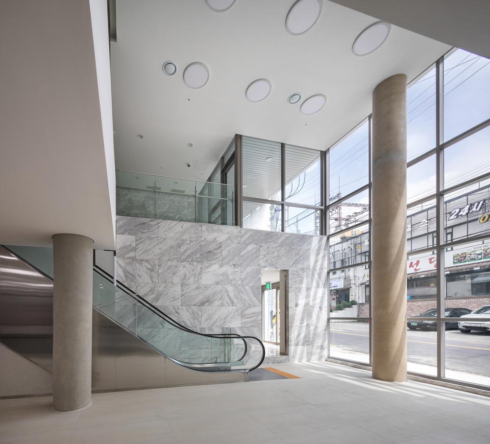 지상 1층은 커튼월시스템을 통한 개방적 입면을 형성하였고, 지상 2층과 3층의 띠 형태의 수평적 형상이 지상 4층~6층의 정형화된 격자형 주 입면을 가진 건축물의 주된 볼륨을 지상으로부터 띄어 받쳐주는 기단 역할을 하도록 계획했다.