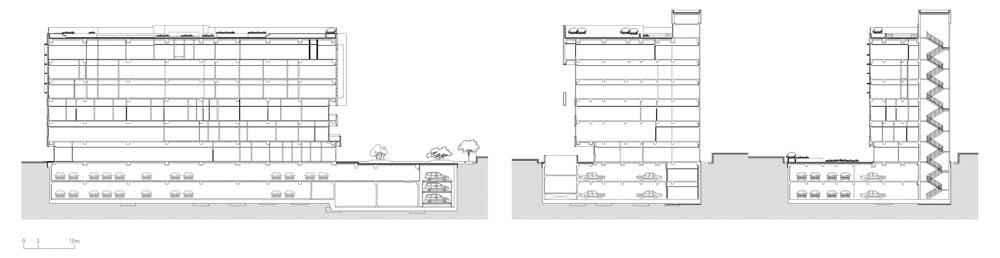 The elevation of the first floor is designed to form an transparent facade in using the curtain wall system, and the horizontal band-shaped elevation of the second and third floors will serve as a platform to support the main body of the building which has a regular lattice-type frame of four to six stories.