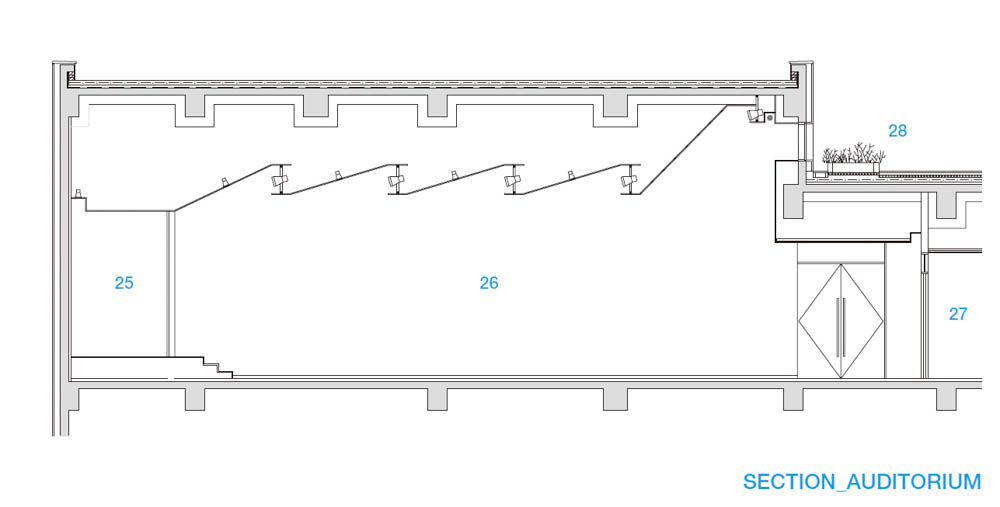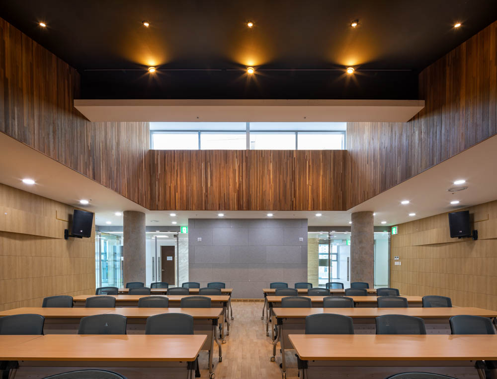 The elevation of the first floor is designed to form an transparent facade in using the curtain wall system, and the horizontal band-shaped elevation of the second and third floors will serve as a platform to support the main body of the building which has a regular lattice-type frame of four to six stories.