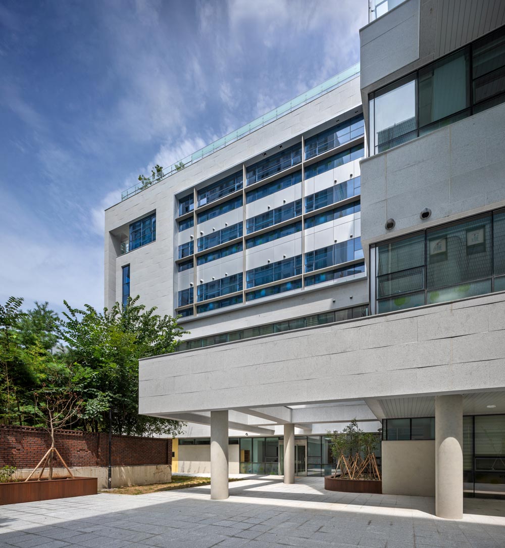 지상 1층은 커튼월시스템을 통한 개방적 입면을 형성하였고, 지상 2층과 3층의 띠 형태의 수평적 형상이 지상 4층~6층의 정형화된 격자형 주 입면을 가진 건축물의 주된 볼륨을 지상으로부터 띄어 받쳐주는 기단 역할을 하도록 계획했다.