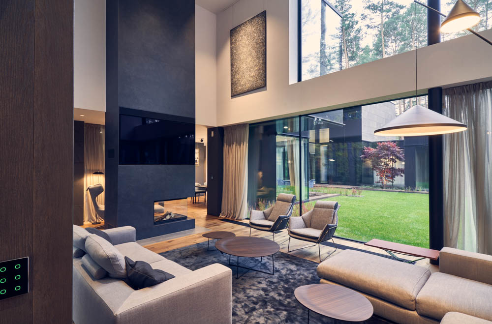 However, the investor, who appreciates privacy, did not wish to hide away from the beauty of the surroundings enveloped by the Kampinos National Park. The answer to these seemingly impossible design assumptions was an atrium, soaring high into the sky, located in the central part of the spared pine trees. The atrium pleasantly and harmoniously seeps nature into the interior of the house, full of daylight, natural materials and spacious glazing.