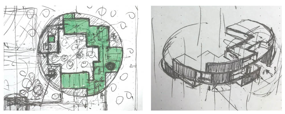 이 집은 숲이 신비한 비밀을 감추고 있다는 생각을 바탕으로 자연 속에 잠겨 있는 집을 컨셉으로 계획하게 됐다. 갤러리처럼 보이는 건물의 특징들을 높게 평가한 투자자, 예술 애호가와 수집가들을 매료시켰다. 이자벨린의 소나무 숲으로 둘러싸인 광활하고 모래가 깔린 대지는 이 집에 독특한 분위기를 형성한다. 서클 우드 하우스는 숲에 대한 존중을 바탕으로 설계됐다. 집은 부담스러운 크기는 아니지만, 차고와 개방된 스파 영역을 조화로운 원의 형태로 닫아주는 돌출된 타원형 프레임 덕분에 외부에서 보기에 그 규모가 인상적이다.