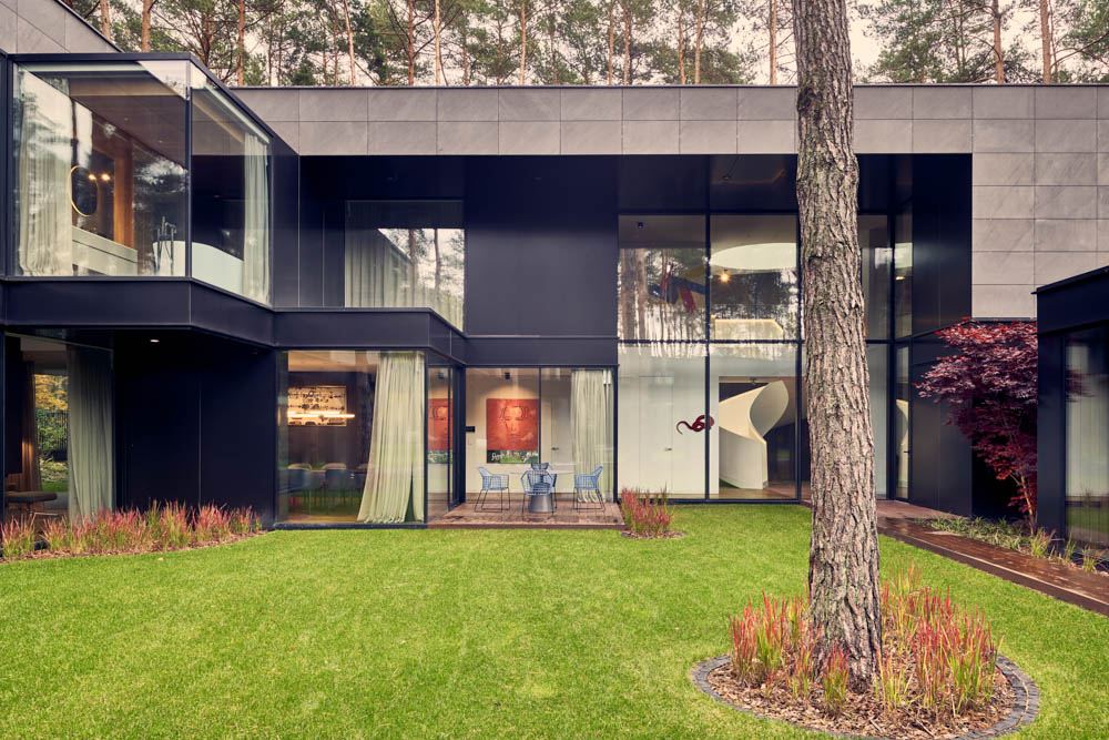 The forest conceals its secrets. Following this philosophy, a project of a house bathed in nature was created. It captivated the investor, an art lover and collector, who appreciated its features alluding to gallery spaces. The vast, sandy plot densely covered with pine forest has created a unique setting for the house located in Izabelin. It was created in the thicket of the forest, and out of respect for it. The house is not overwhelming in size, yet may well impress with its scale from the outside. It is all thanks to an overhanging oval frame that encloses the garage and the open spa area in a harmonious circle.