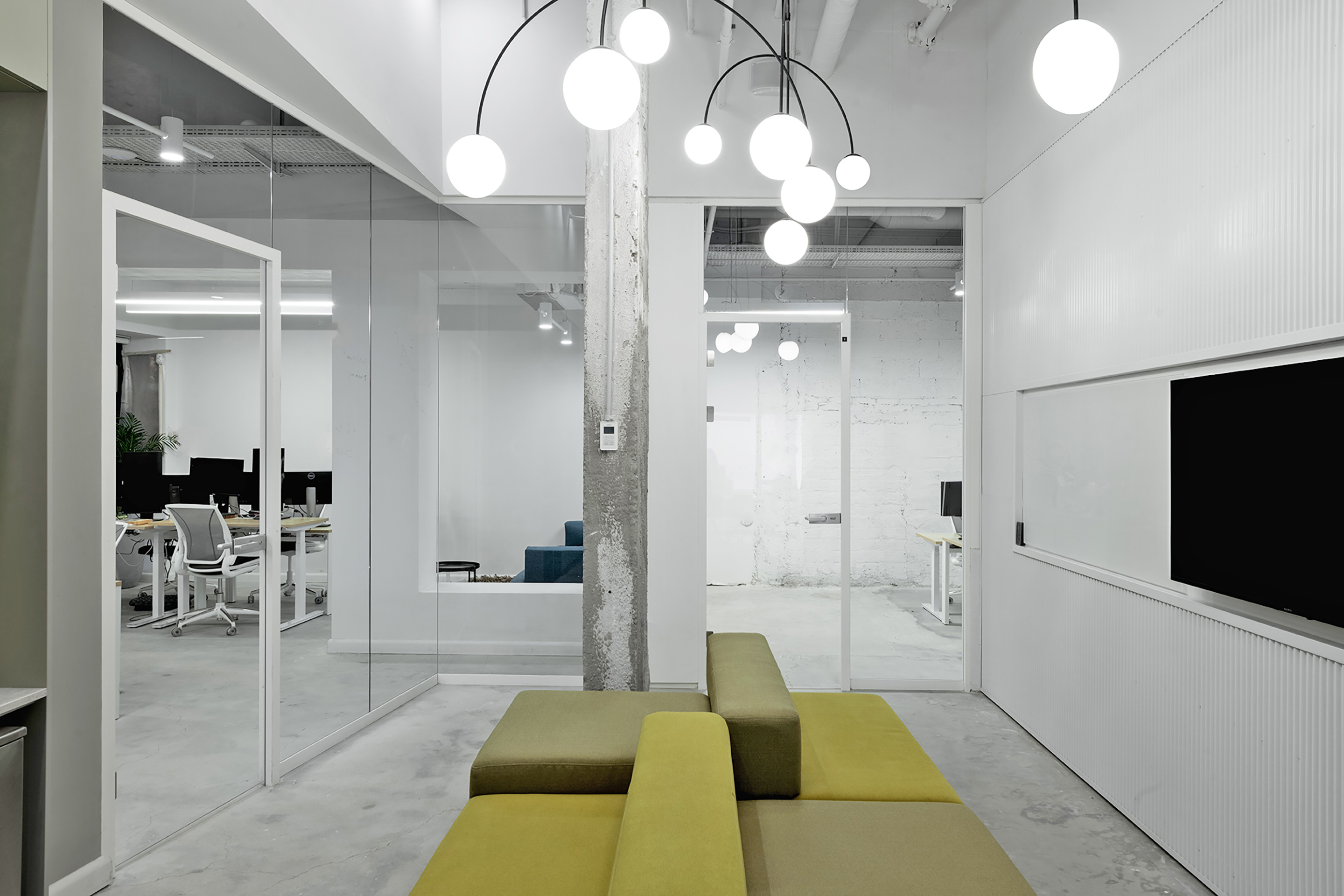 The company, which specializes in gaming and applications, sought to create a wholesome, pleasant, soft and light-filled space with few interferences. The architects decided to work with a wide range of materials and textures while keeping the color palette subtle and limited. The main building design includes a bright entrance and waiting area, 5 self-contained working areas for each team with their own lounge for meet-ups overlooking the inner courtyard and small meeting rooms. A large bar, essentially part of the courtyard, is surrounded by a tribune that generates interactions every hour of the day.