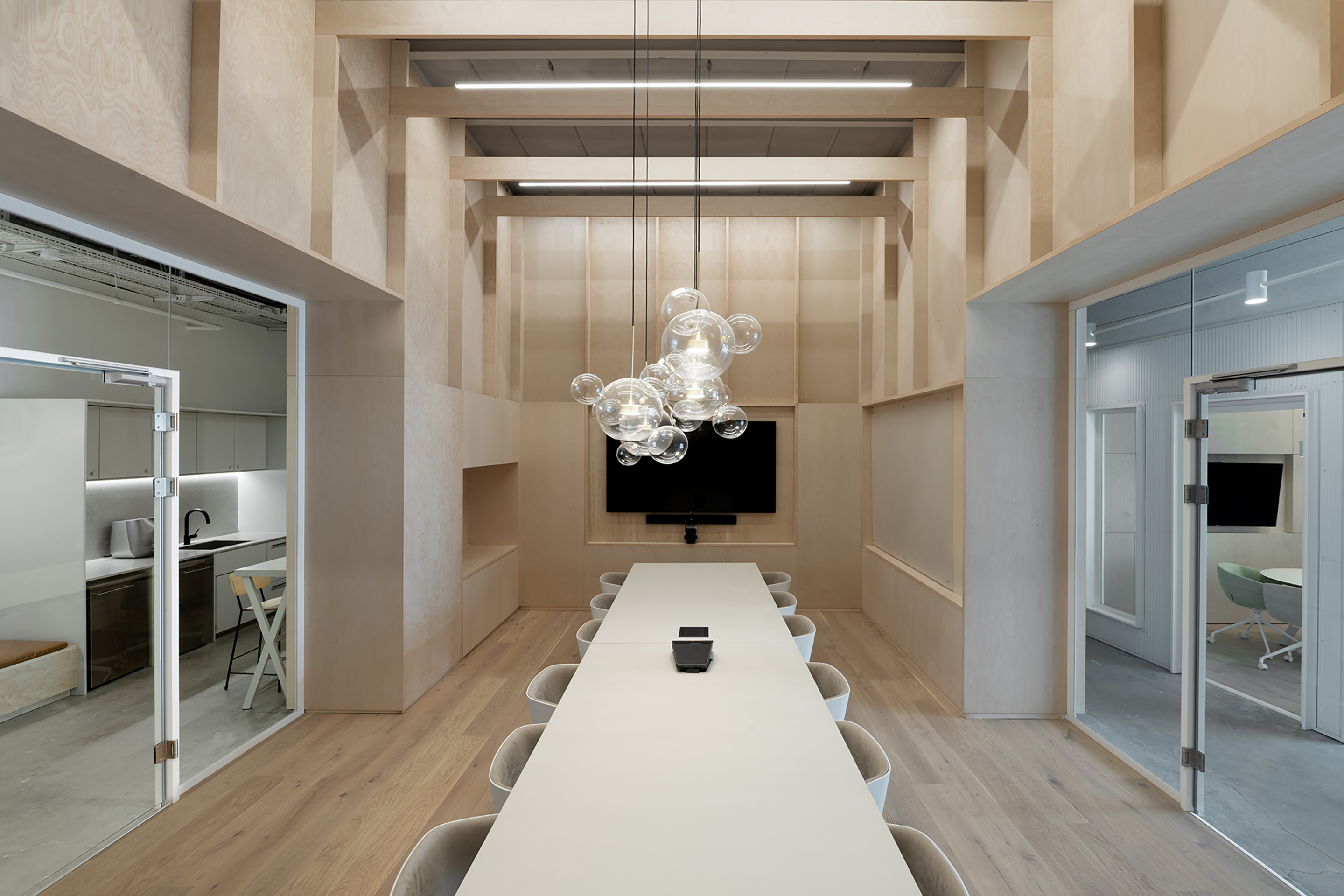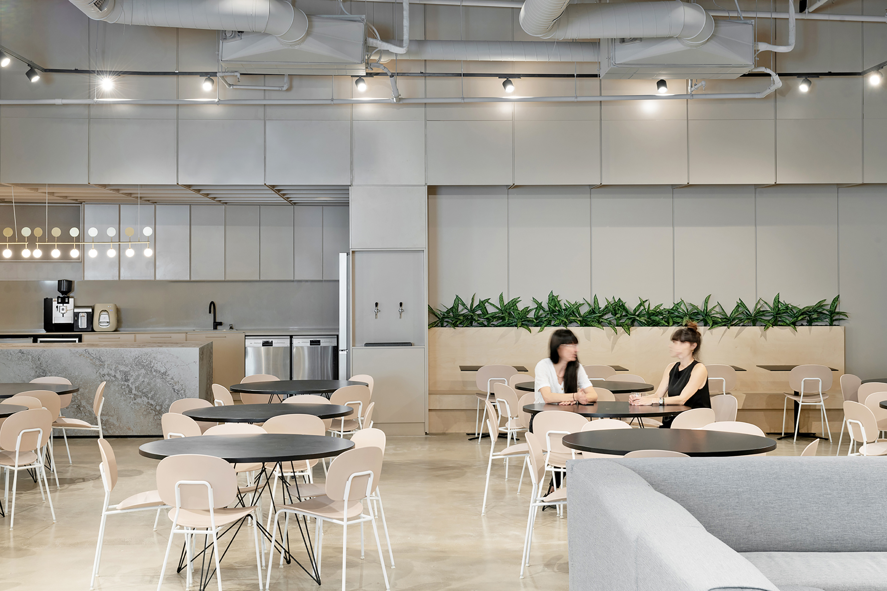 주방에서 9m 길이의 아일랜드 식탁은 하루 종일 음식이 제공된다. 그 아일랜드 식탁은 술집처럼 근무 시간 동안 활발한 공간이 된다. 건축가들은 집중식, 플러싱, 공간 중심 또는 작업자의 개인적인 옵션 등 다양한 옵션을 가능하게 하는 조명 설비의 시스템을 만들었다. 기술 조명과 함께 산업화된 천장과 넓은 콘크리트 기둥을 세련되게 만드는 고전적인 조명기구가 사용됐다.
