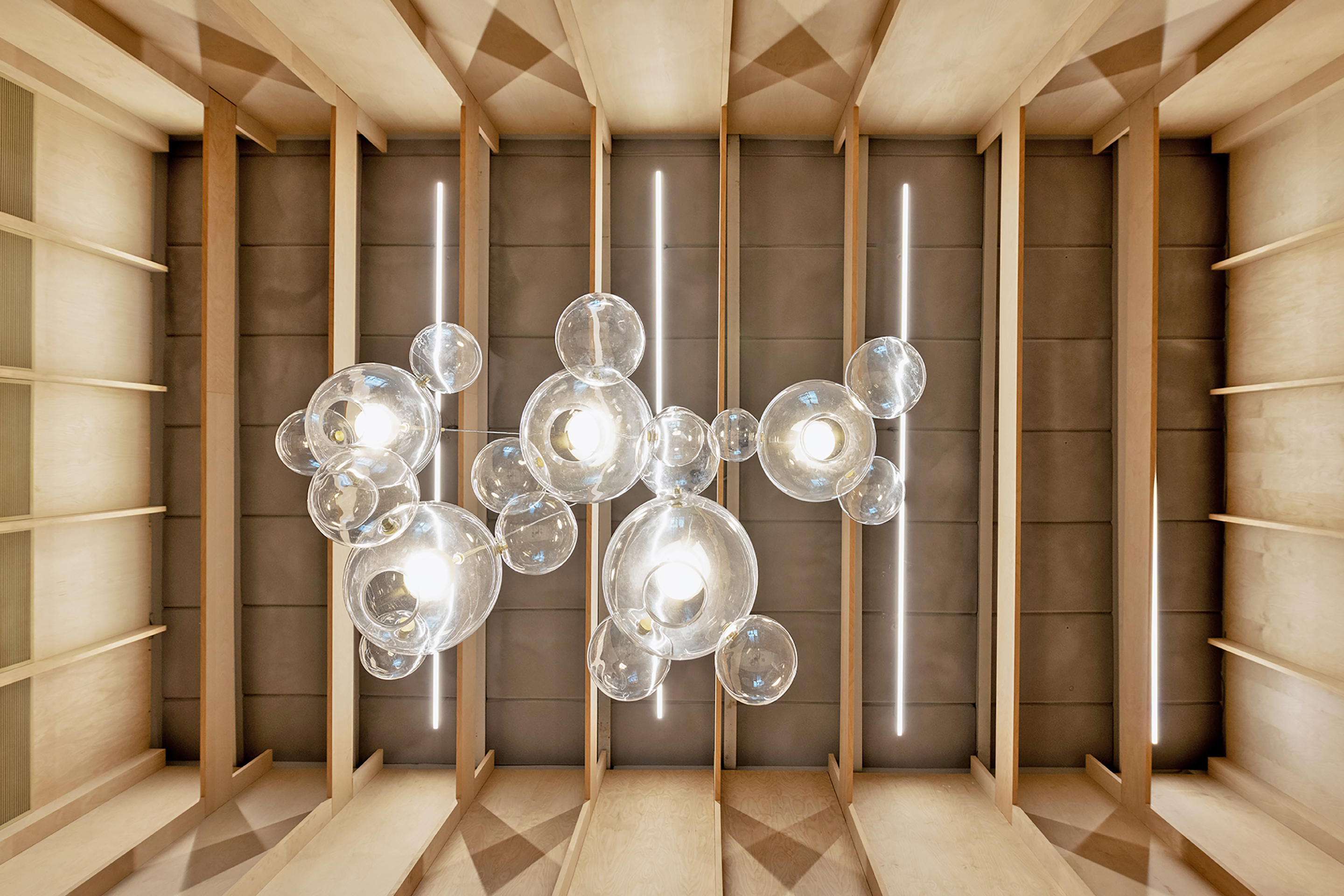 On the roof of the two main buildings, a large balcony overlooks the rooftops of the south of the city. The architects decided to leave the "white boxes" and expose the structural elements made of concrete. The exposed systems of the ceiling are painted a delicate gray and the window openings were enlarged in order to strengthen the connection between the interior and exterior. Wide use of bright birch wood and quartz surfaces in delicate natural tones combined with light painted walls allow natural light to enter the spaces freely.