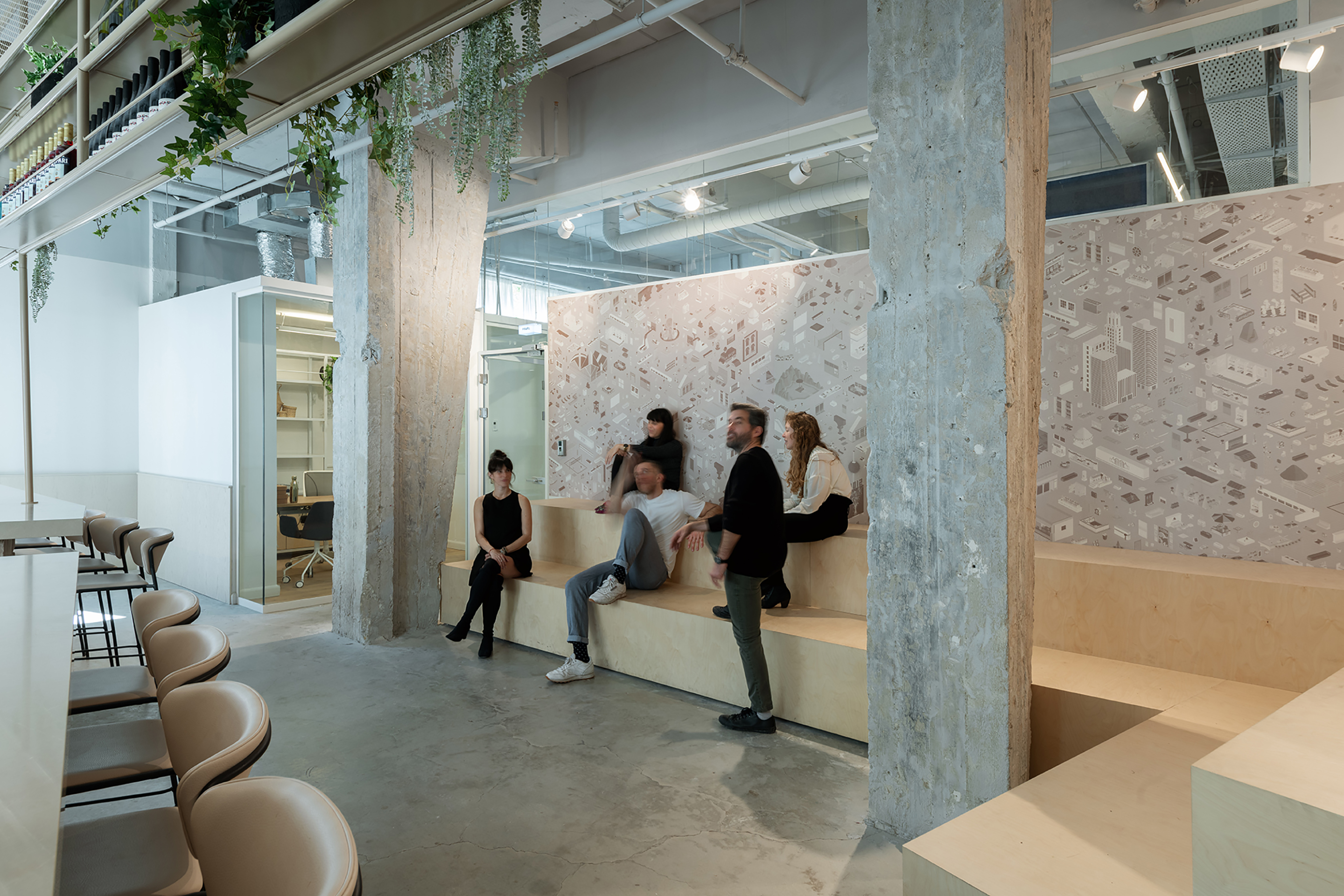 게임과 애플리케이션을 전문으로 하는 이 회사는 간섭이 거의 없는 건전하고 쾌적하며 부드럽고 가벼운 공간을 만들기 위해 노력했다. 건축가들은 색상 팔레트를 섬세하고 제한적으로 유지하면서 광범위한 재료와 질감을 가지고 작업하기로 했다. 본관 디자인은 밝은 입구와 대기공간, 팀별로 5개의 자급식 작업공간과 안마당이 내려다보이는 만남의 공간, 작은 회의실 등이 있다. 기본적으로 안뜰의 일부인 큰 바는 매일 매시간 상호작용을 하는 연단(演壇)에 둘러싸여 있다.