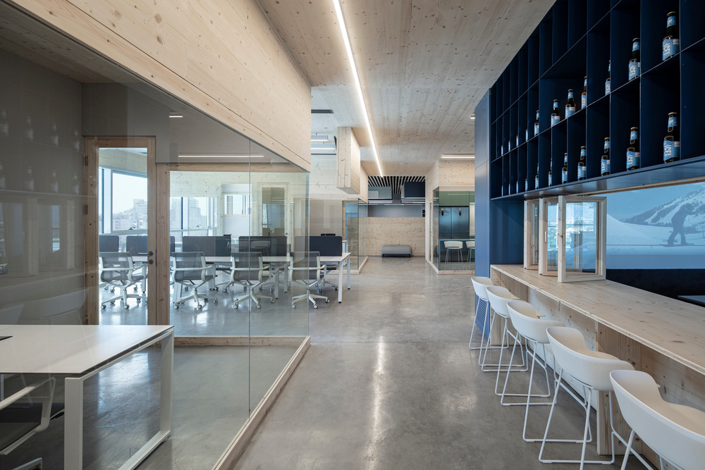 Upon entering the office’s main glass door, visitors are greeted by a wide reception desk and seating area. Behind the reception desk, a wall cupboard rotates into the space, transforming into an après ski open bar, complete with a large iron library. A pinewood harmonica window separates the bar from a large adjacent conference room. When opened, the window connects the bar with the conference room to create a larger open space. The conference room also serves as a sort of courtyard area, where conference calls are held with various ski resorts and big screen TVs broadcast skiing events from around the world.