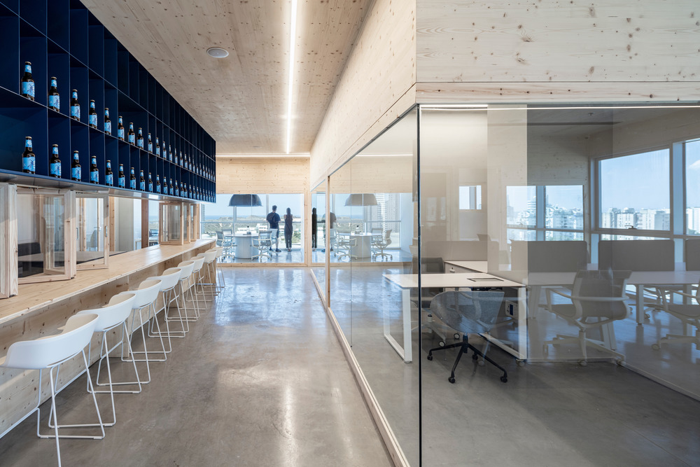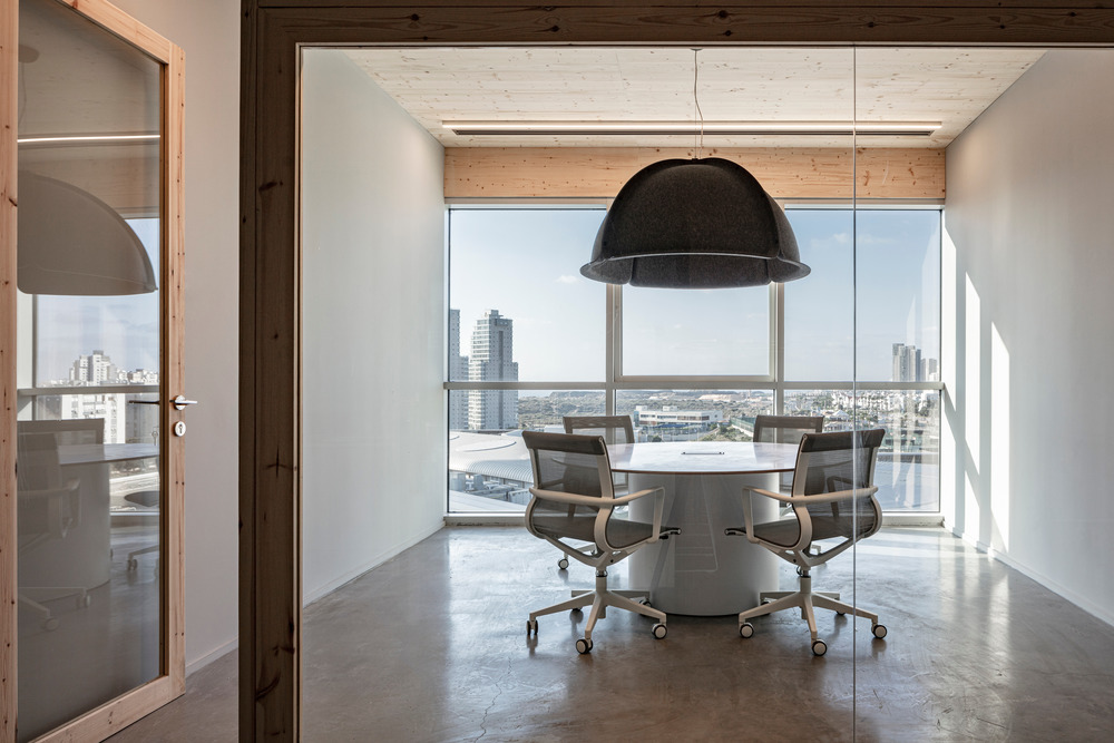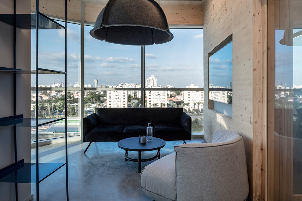 Inspiration for the 350 square meter office design is derived entirely from the world of skiing, including materials, colors, ambiance, and experiential elements. The objective was to design a ski environment within the office space that sits in complete contrast to the dry desert climate of its Israeli surroundings, presenting an alternative reality to the outside world. The primary focus of the project was to create an environment where employees and customers would genuinely feel as if they were entering a ski resort. While many design projects incorporate surrounding landscapes as a complement, the SkiDeal office’s proximity to the Mediterranean Sea presented views that stood in contrast to the theme of the space.