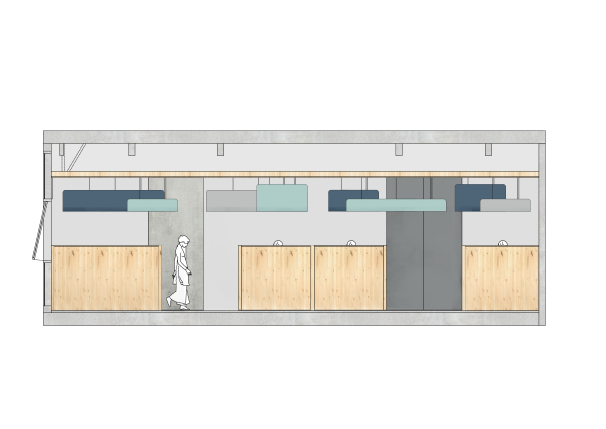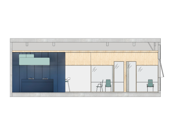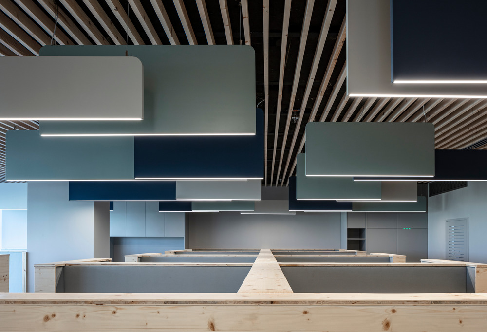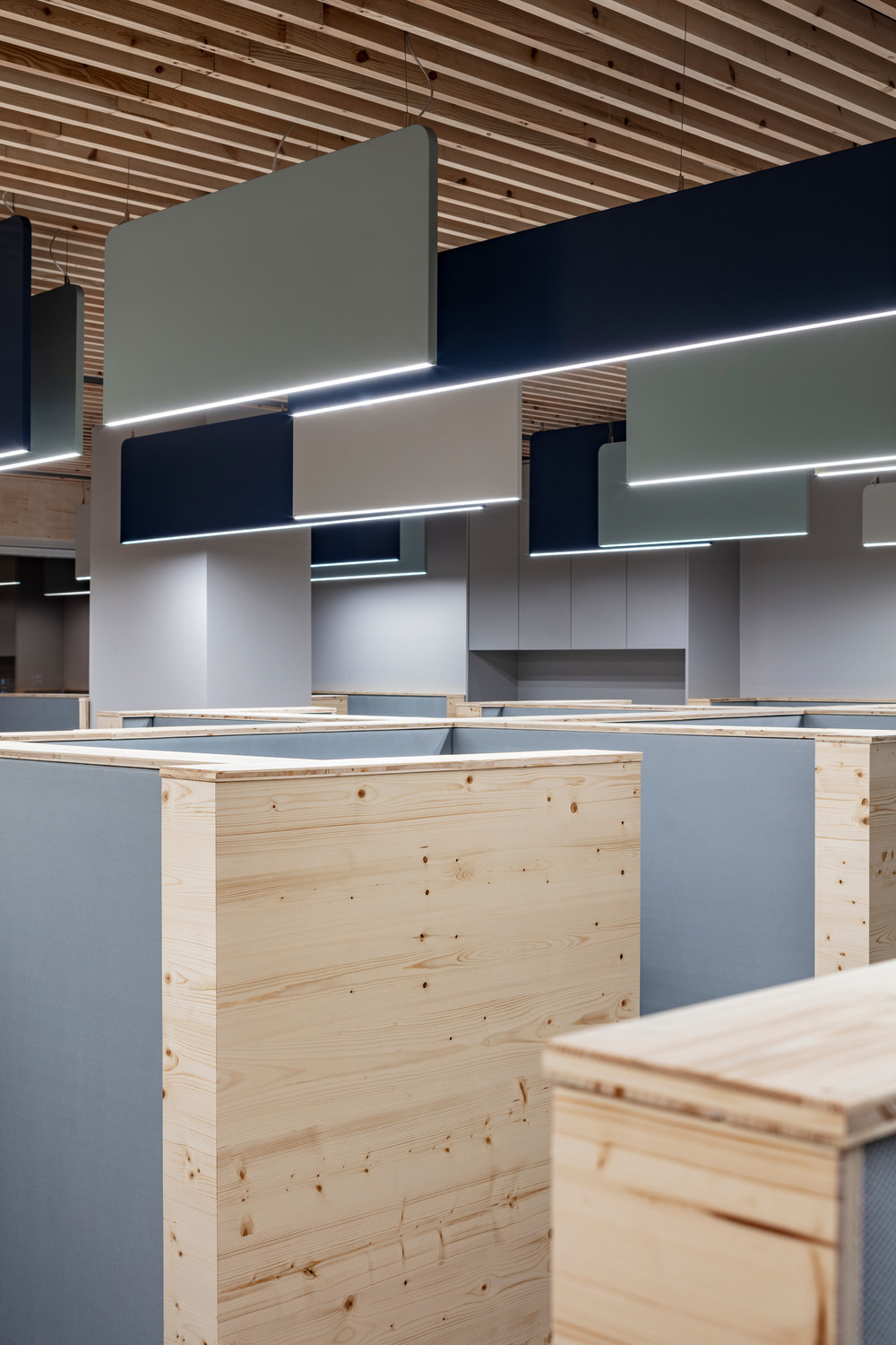 The company’s reservations area sits adjacent to the reception area, ensuring that those entering the office are immediately immersed in the working environment. Employees in the reservation area sit around a large conference table, centered by a screen that hangs from the ceiling. The office also houses a smaller conference room, a large employee kitchen, and a spacious sales area, all divided by low partition walls made of three-layer pinewood lined with gray acoustic upholstering. Additionally, there is some flexible space for executive rooms and other requirements that the company may have.