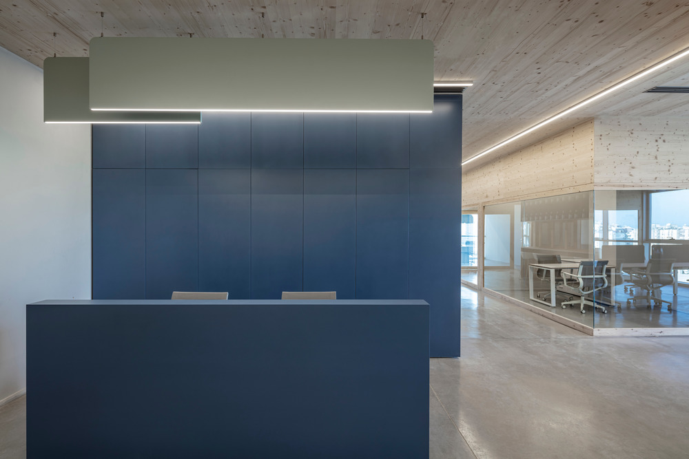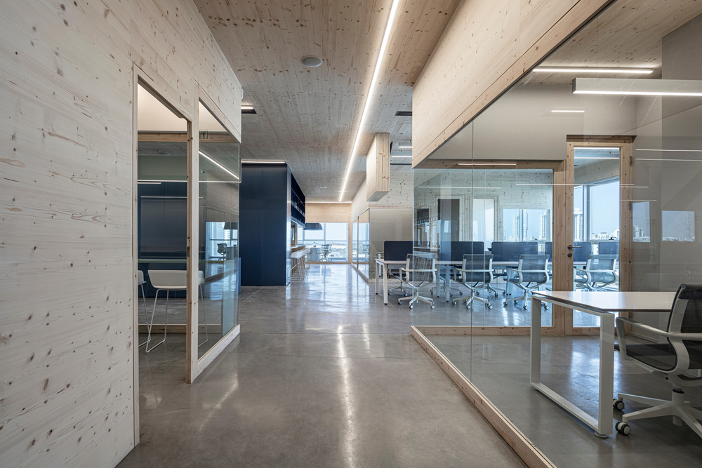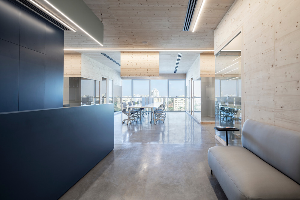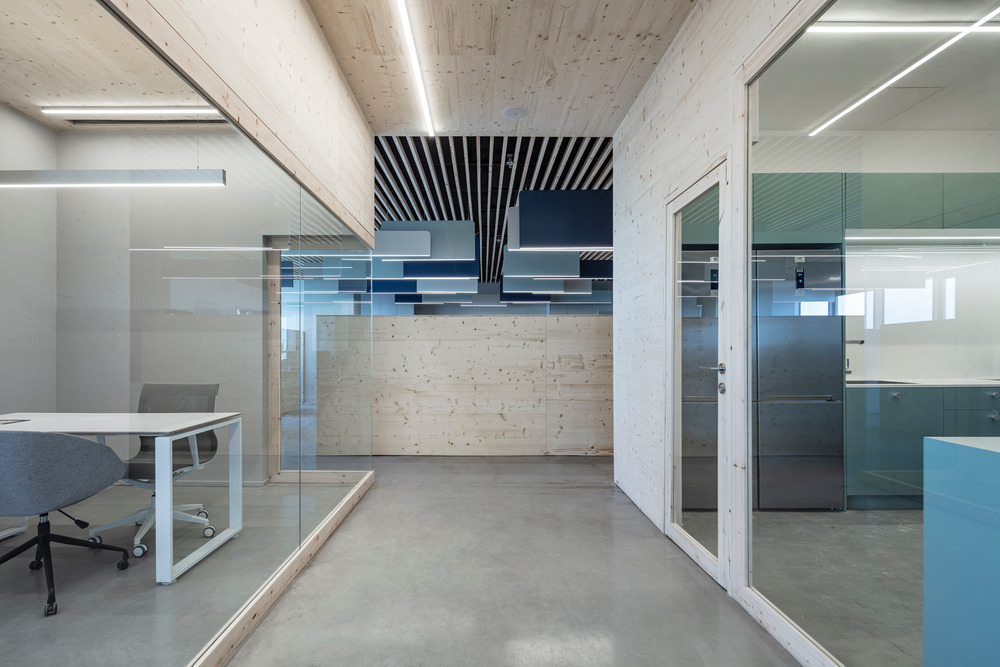 “In addition to the main concept of creating a ski environment, we were very cognoscente of the fact that this is a functional office, so our approach also focused on noise reduction that facilitates the transition,” says designer Keren Offner. “In terms of ambiance, our choice of materials and colors serve to transition people to the skiing world.” One of the challenges to the overall design was balancing the intimacy of the environment with the concept of an open office space. The solution came in the form of glass walls with pinewood frames, and office divisions that pass through drywall openings.