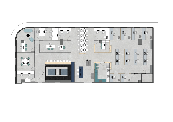 회사의 예약 구역은 리셉션 구역과 인접해 있어 사무실에 들어오는 사람들이 즉시 작업 환경에 몰입할 수 있도록 한다. 예약 구역의 직원들은 천장에 매달린 스크린을 중심으로 대형 회의 테이블 주위에 앉는다. 사무실에는 또한 작은 회의실, 큰 직원용 주방, 넓은 판매 공간이 있으며, 모두 회색 음향 덮개로 덮인 3층 소나무로 만든 낮은 칸막이 벽으로 나뉜다. 경영진용 공간과 기타 요구사항을 위한 공간이 있다.