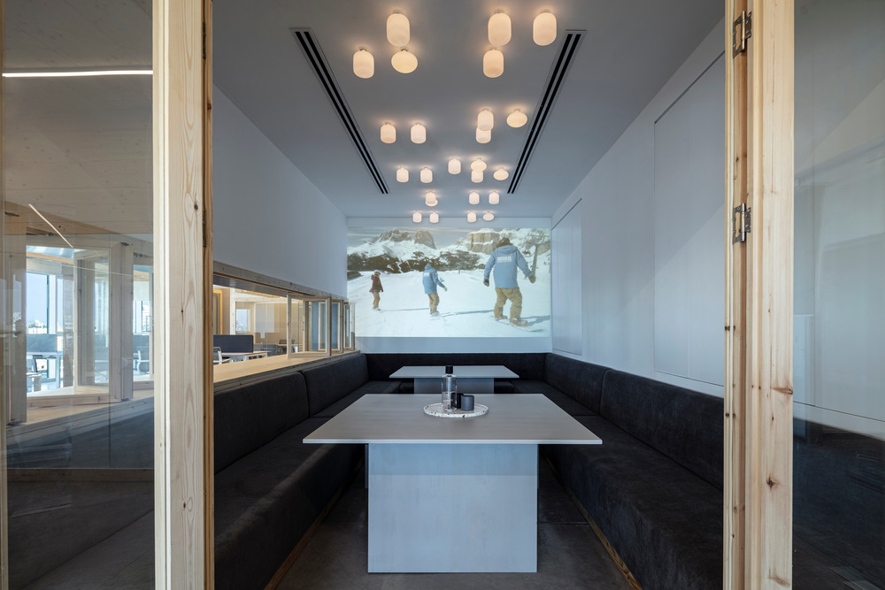 Upon entering the office’s main glass door, visitors are greeted by a wide reception desk and seating area. Behind the reception desk, a wall cupboard rotates into the space, transforming into an après ski open bar, complete with a large iron library. A pinewood harmonica window separates the bar from a large adjacent conference room. When opened, the window connects the bar with the conference room to create a larger open space. The conference room also serves as a sort of courtyard area, where conference calls are held with various ski resorts and big screen TVs broadcast skiing events from around the world.