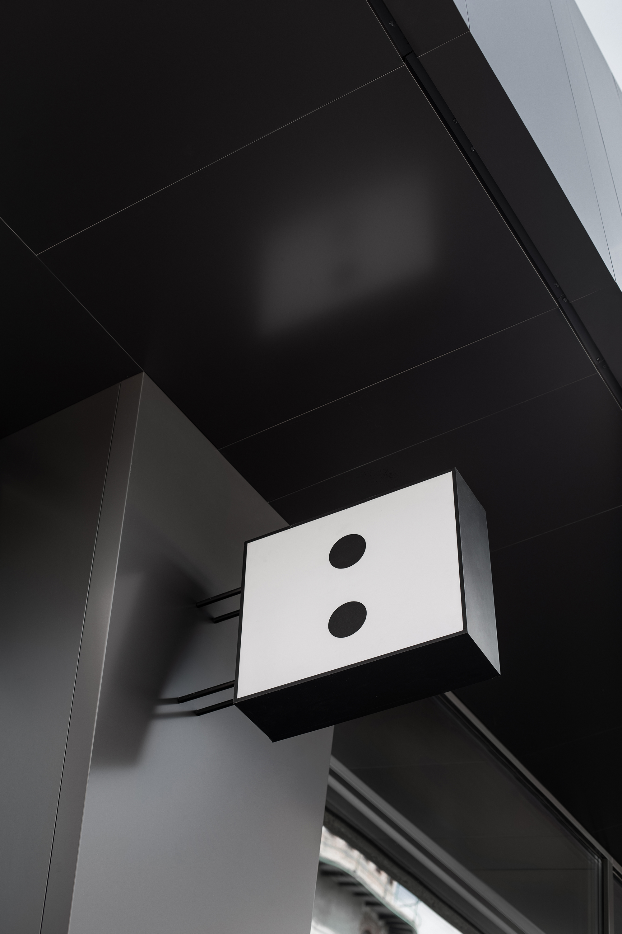 The facade is simple and unpretentious. In tune with the interior, dark foundation is finished with aluminum composite panels. By the main entrance, we created an open terrace that is also a long seating place that attracts street traffic.