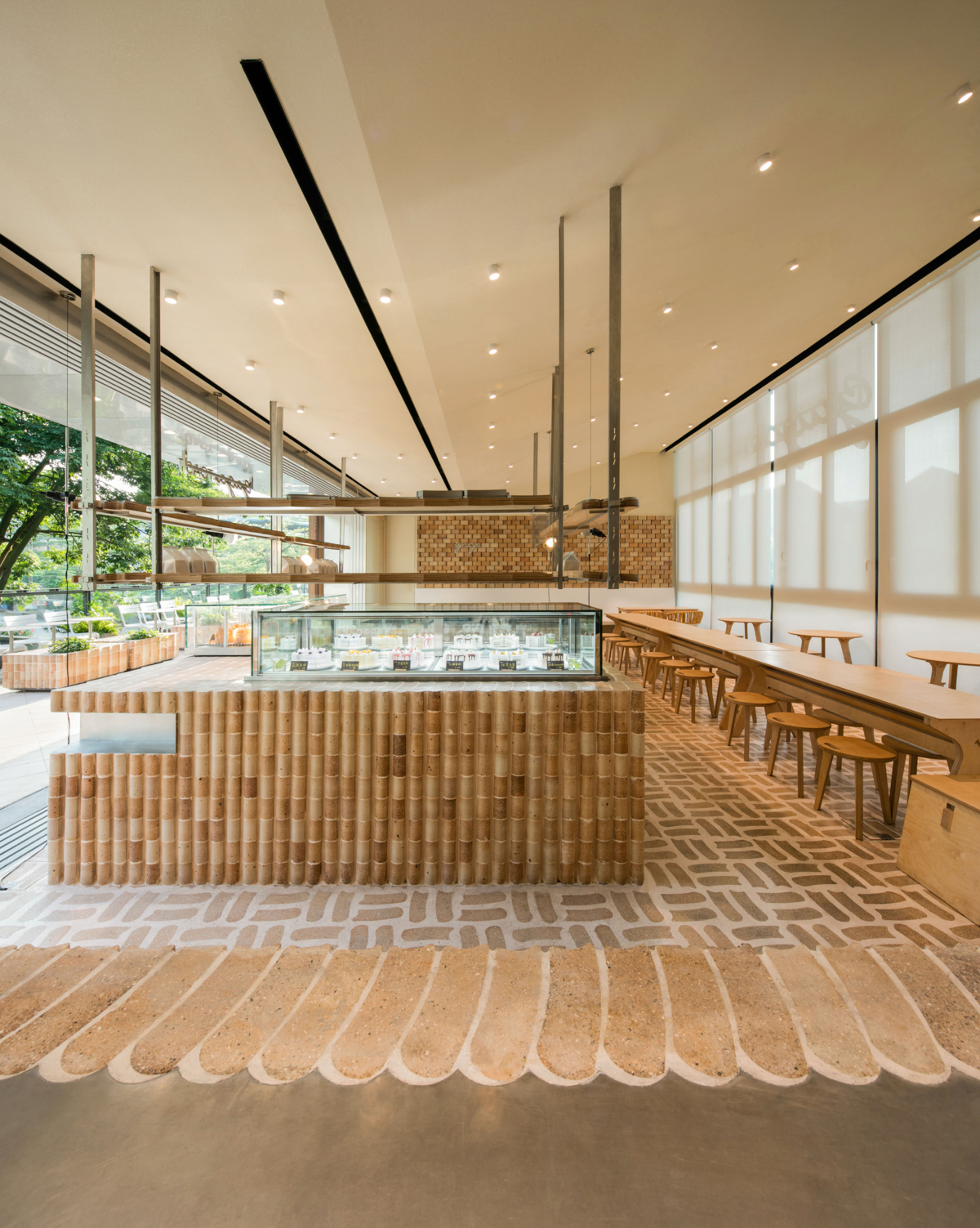 다양한 기능을 위해 다양한 조합이 설계되었으며 벽에서 바닥, 카운터, 상품 진열장, 이동식 진열장까지 전체 공간에 적용되었다. 벽돌을 형성하는 데 사용된 금형도 활용하여 브랜드 관련 상품과 진열대로 사용된다.