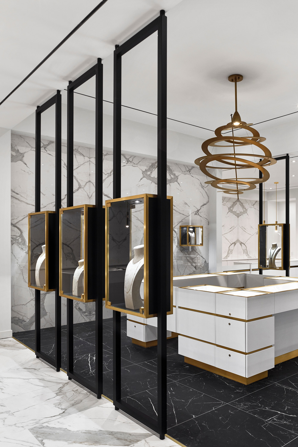 "보석상점은 전통적으로 브랜드와 제품이 관심을 끌기 위해 경쟁하는 등 복잡함을 느낄 수 있습니다. 우리의 과제는 단순하고 미니멀한 비주얼 스타일을 만들어 전시된 멋진 보석들을 집중 조명하는 것이었습니다."라고 건축가는 말한다. "이를 위해 우리는 맞춤형 보석 케이스를 설치하고 주요 초점으로 시선을 전달하는 대비 톤을 사용했다. 결과는 세련되지만 위협적이지는 않으며 보석을 스타로 만들어 준다.