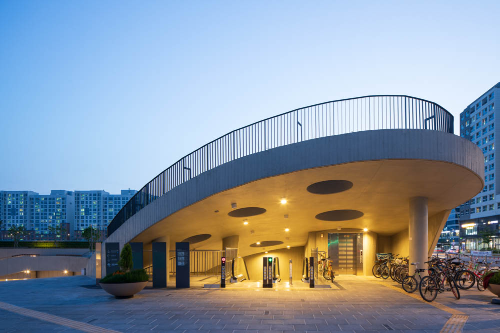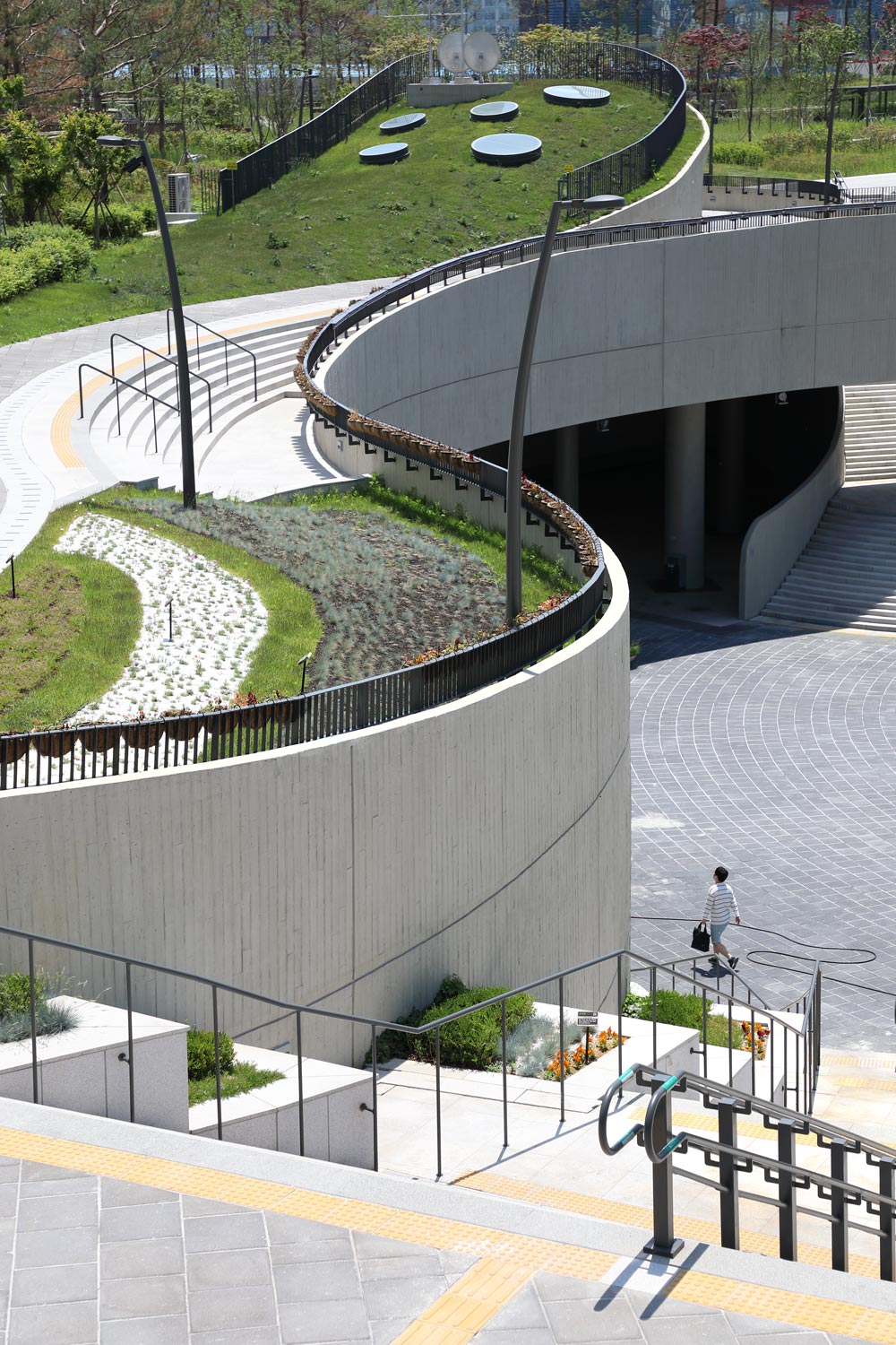 The streamlined form of the subway entrance corresponds to the surrounding landscape and produces a sense of unity in the square. The form was created by elevating the ground surface so that it serves as the background for the surrounding city. Shade trees are sparsely arranged along movement paths to provide the necessary greenery while leaving as much space as possible for cultural activities.