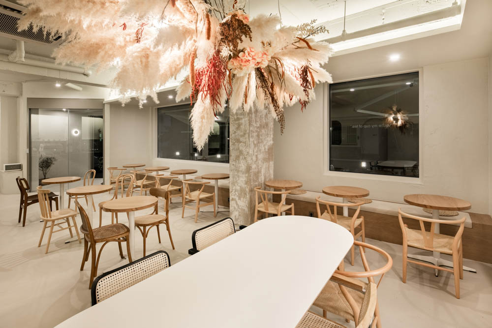 The facade design of Persimmon Coffee uses soft curves and arches rather than straight lines so that those who see it can feel more comfortable and secure. Persimmon Coffee’s exterior facade canopy emphasized the entrance by highlighting the arch design, and the color was also finished with warm gray colors to harmonize the exterior tone of the building. The left and right sides of the exhibition space at the entrance to the cafe were styled with red corallites, highlighting the earthy style concept. In front of the entrance, there is a counter space designed in a round form, and there is a kitchen space designed with pebble-shaped fixed windows. On top of the long tables in the interior, hanging plants accentuated with reeds were placed as a visual fun factor, and the natural textured vintage artworks were installed on the pillars to lightly express a nature-friendly feeling. The interior space is a space that completes the earthy style by placing natural rattan furniture and items that have a natural feeling.