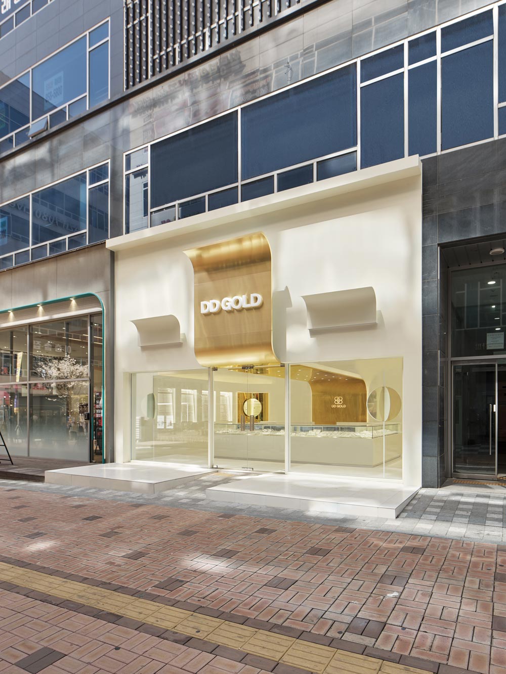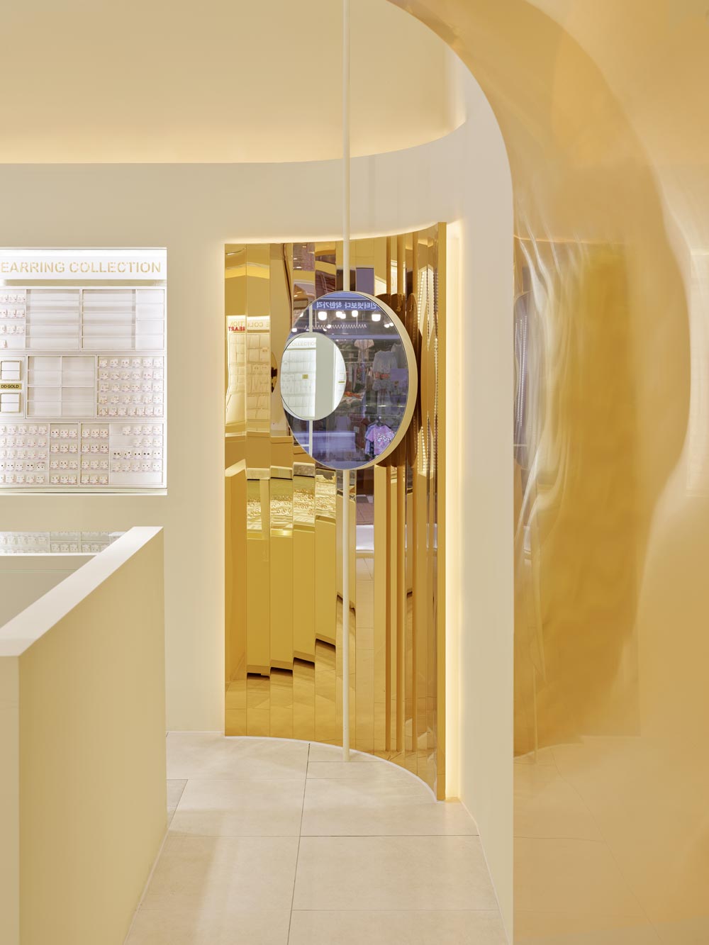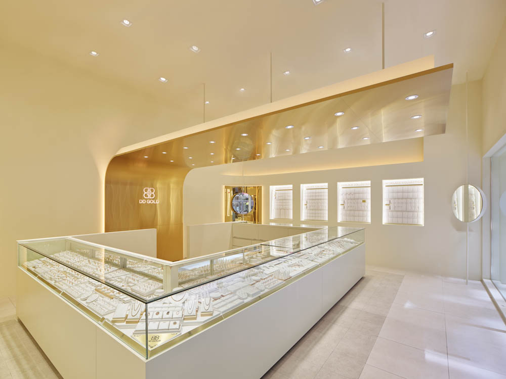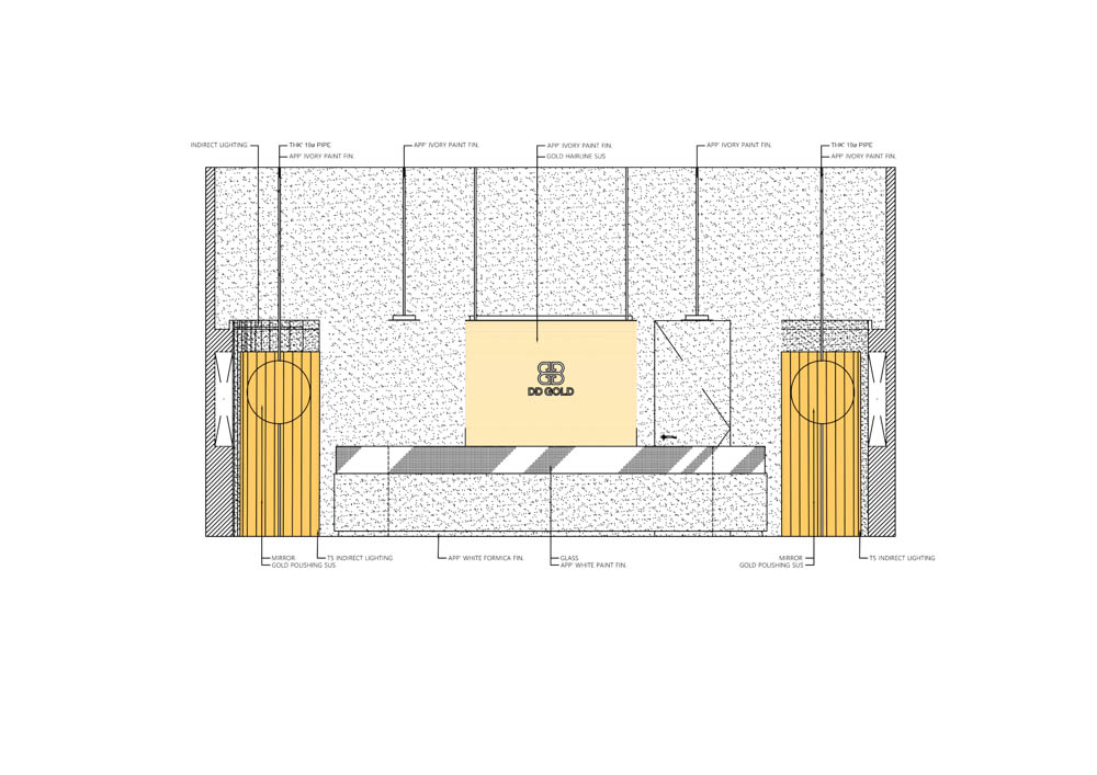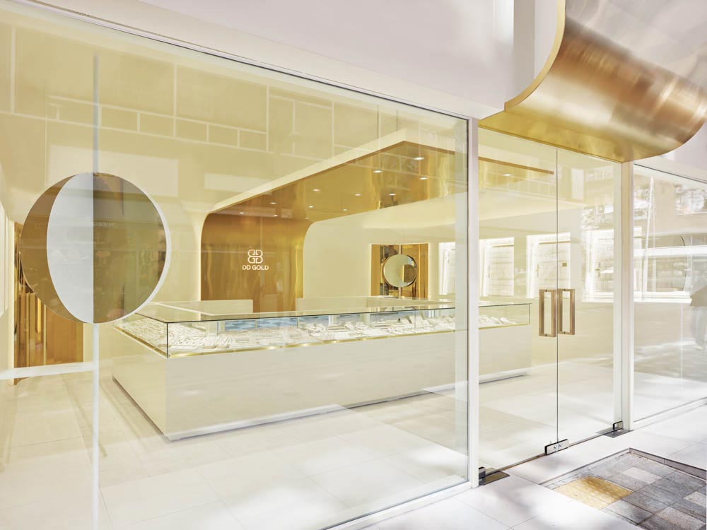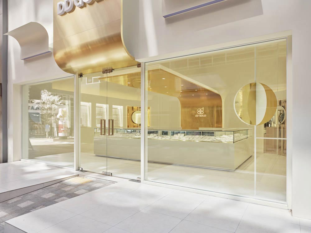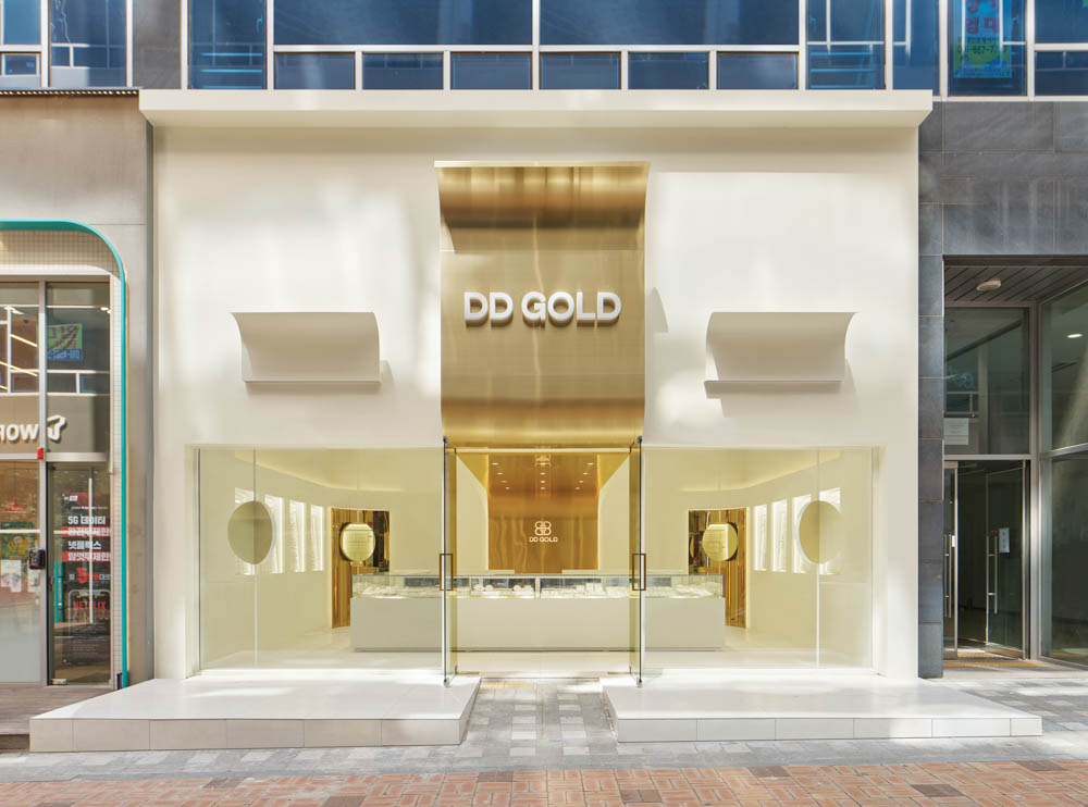 Using the fact that the high floor height meant a wider signboard area on the facade, we thought of a concept where a majestic gold wave cascades down the front side of the facade and is continued to the inside. The gold wave continues into the space and extends deep inside the interior of the shop, and has a design accent point with a form that flows down to the floor again on the wall that splits the office and the shop. This allowed us to draw a design that solves the problem of the facade, a low ceiling that shines the main jewelry shelf as well as the interior signage wall. In addition, a circular-shaped mirror design was layered with the gold round walls in the four corners of the space to serve as a sub role that strengthens the gold wave that runs through the center of the space. Within an ivory tone, which has a neat mood, gold was used as an accent finishing material in various ways, including polishing and hairline, to complete DD Gold's unique, simple yet impactful design that allows the jewelry to stand out.