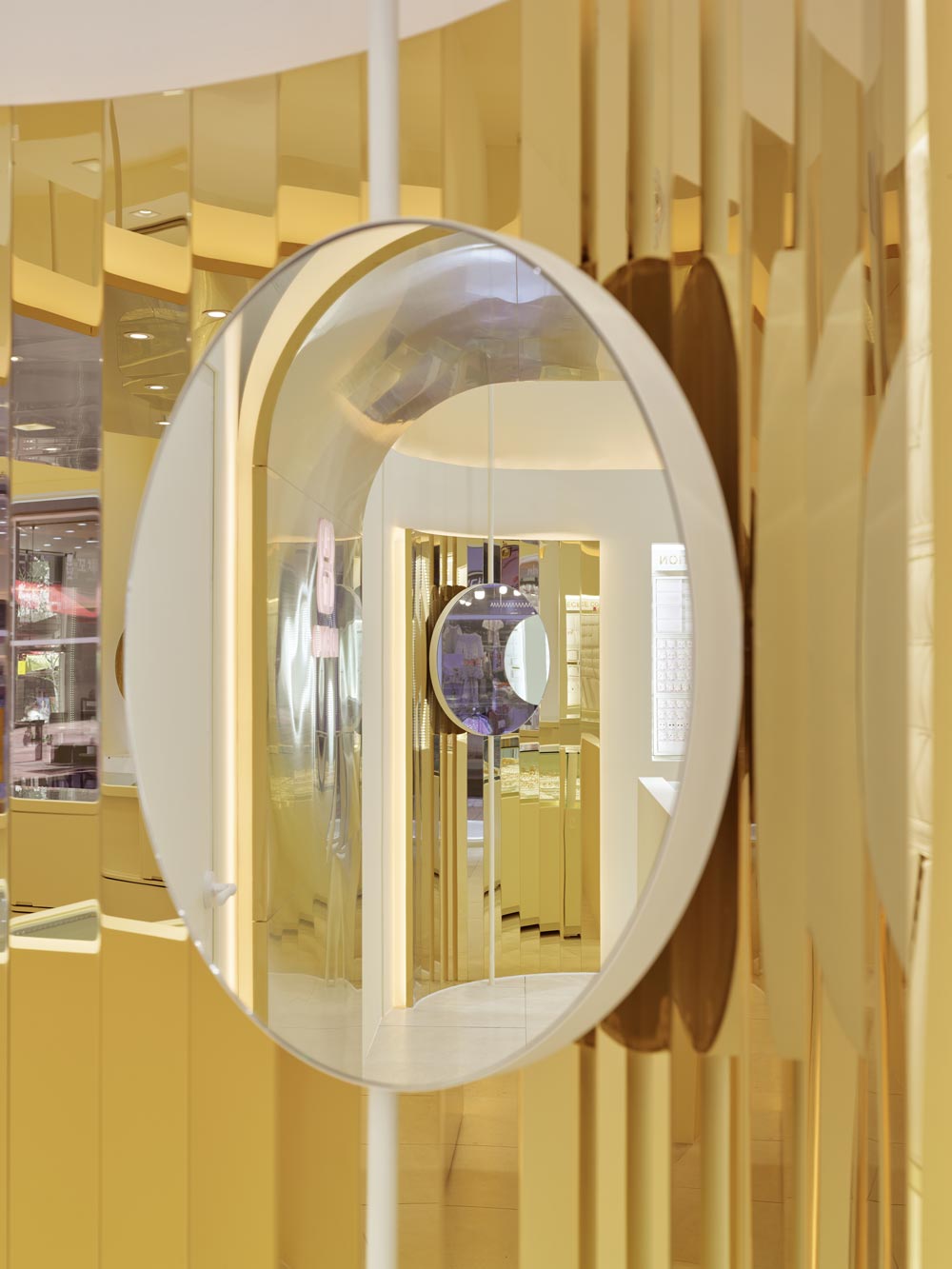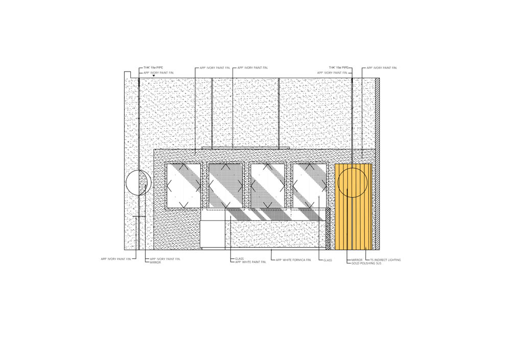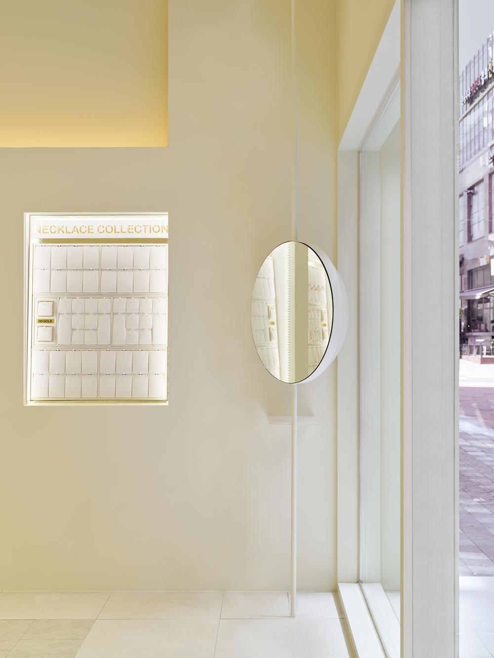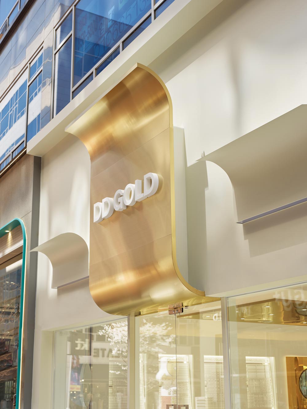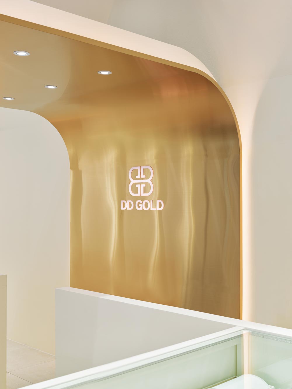 Using the fact that the high floor height meant a wider signboard area on the facade, we thought of a concept where a majestic gold wave cascades down the front side of the facade and is continued to the inside. The gold wave continues into the space and extends deep inside the interior of the shop, and has a design accent point with a form that flows down to the floor again on the wall that splits the office and the shop. This allowed us to draw a design that solves the problem of the facade, a low ceiling that shines the main jewelry shelf as well as the interior signage wall. In addition, a circular-shaped mirror design was layered with the gold round walls in the four corners of the space to serve as a sub role that strengthens the gold wave that runs through the center of the space. Within an ivory tone, which has a neat mood, gold was used as an accent finishing material in various ways, including polishing and hairline, to complete DD Gold's unique, simple yet impactful design that allows the jewelry to stand out.