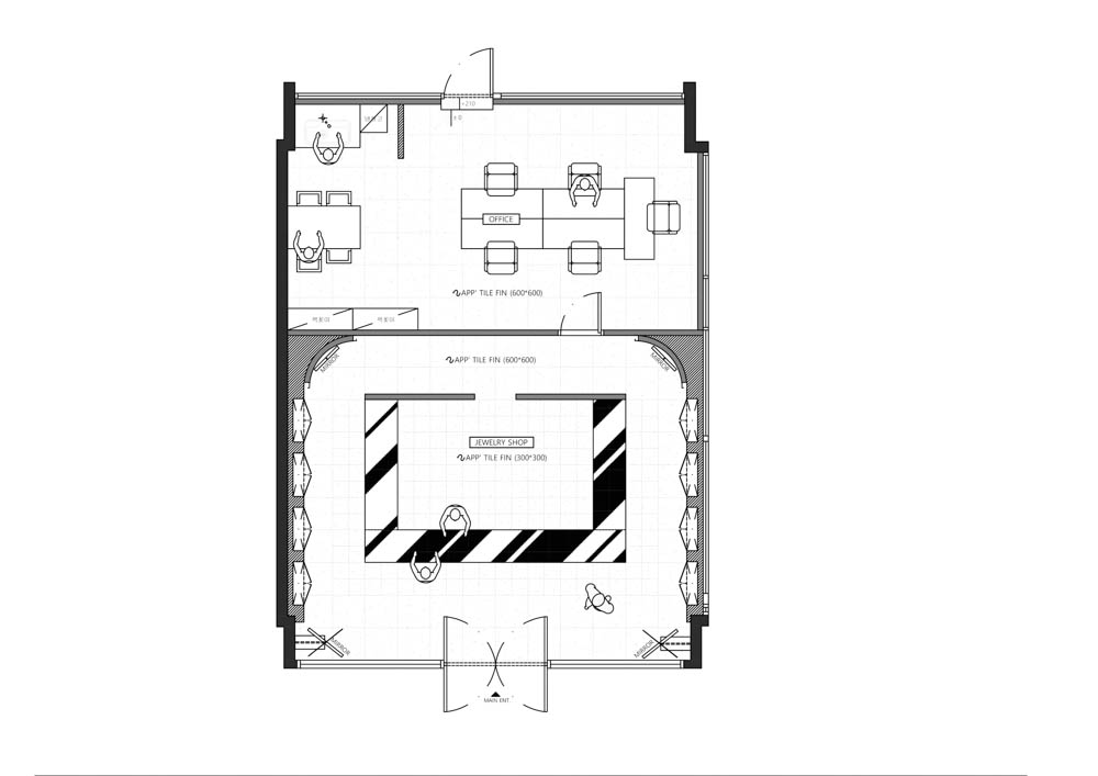 Spatial design can give a differentiated identity to a space with innovative ideas and concepts, but we also think that it is important to solve the answer with a smart and reasonable approach in many given situations and constraints. In that sense, this DD Gold project seemed to be a project that drew a reasonable design plan under various conditions. The client’s requests were adamant. Considering the fact that it is located on the first floor of a large commercial building, to have an impact strong enough to draw people’s attention among the shops lined up on either side, and a bright illumination level that would allow the jewelry to stand out in the light. The site was about 23 pyeongs, but under the condition of using it as both an office and a shop, there were decisive factors that affected the design. The area of the shop, which became smaller to about 14 pyeongs, and the 4,100mm floor height, which is too high for the jewelry to receive direct lighting from up close.