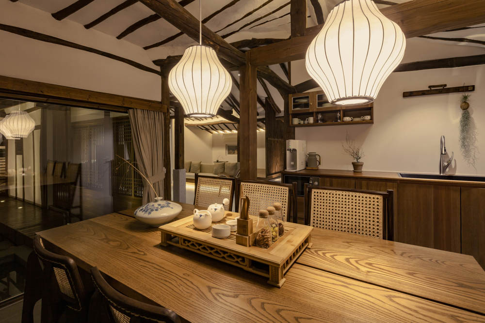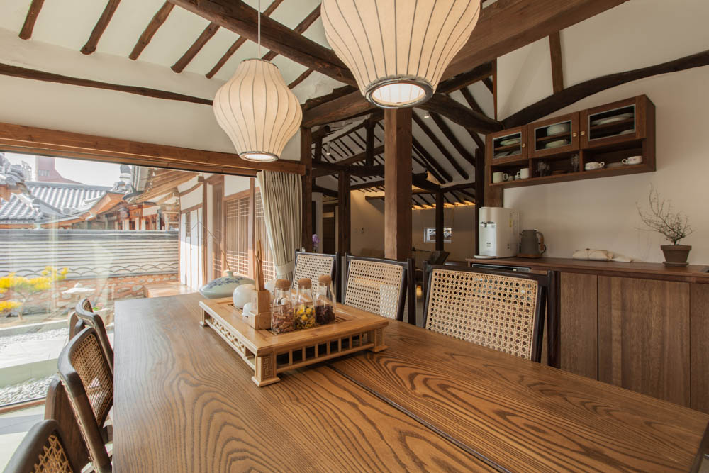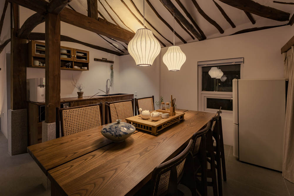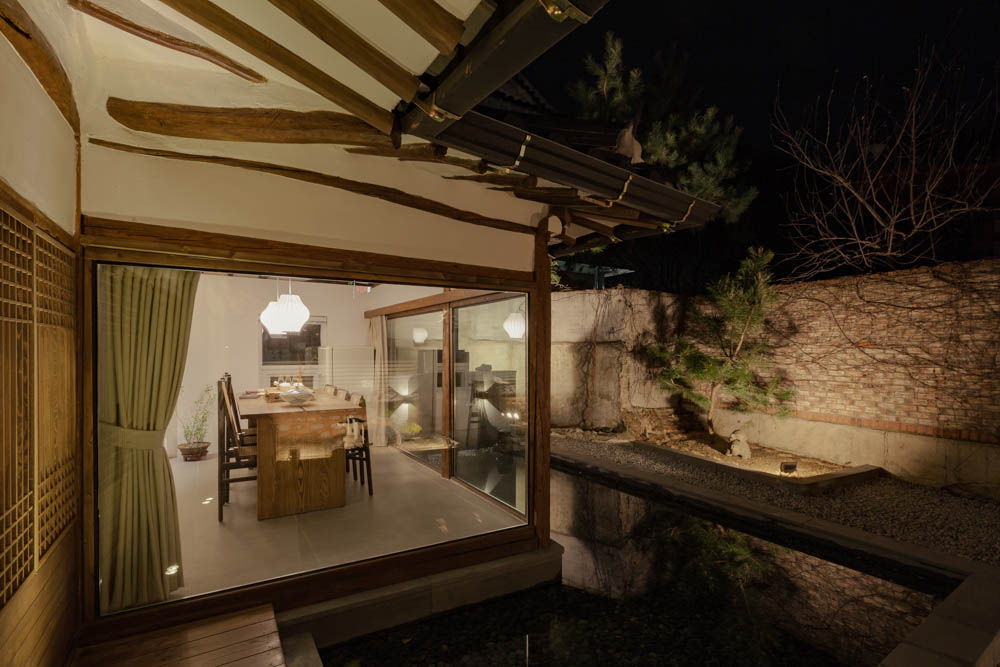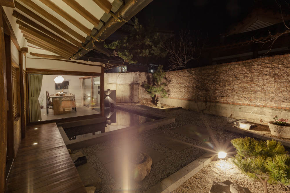 When the weather is warm, we think that the wooden porch will become a time traveling space where one can sit on and take some time to look back on the past or cool their head. What would the interior be like at night? The subtle and warm lights brighten up the interior. In the dining space at night, the light is reflected on the glass and the atmosphere reflected in the water space creates a truly elegant space. That was the interior of Jeonju Hanok stay Mooryeob. Mooryeob, which aims to be a premium hanok stay overall. We wanted to propose a hanok stay where the entire hanok building can be used, while maintaining the quality of the hotel. In particular, it was a project where we gave a lot of thought for when 4 or more visitors use the hanok, rather than 1~2 people.
