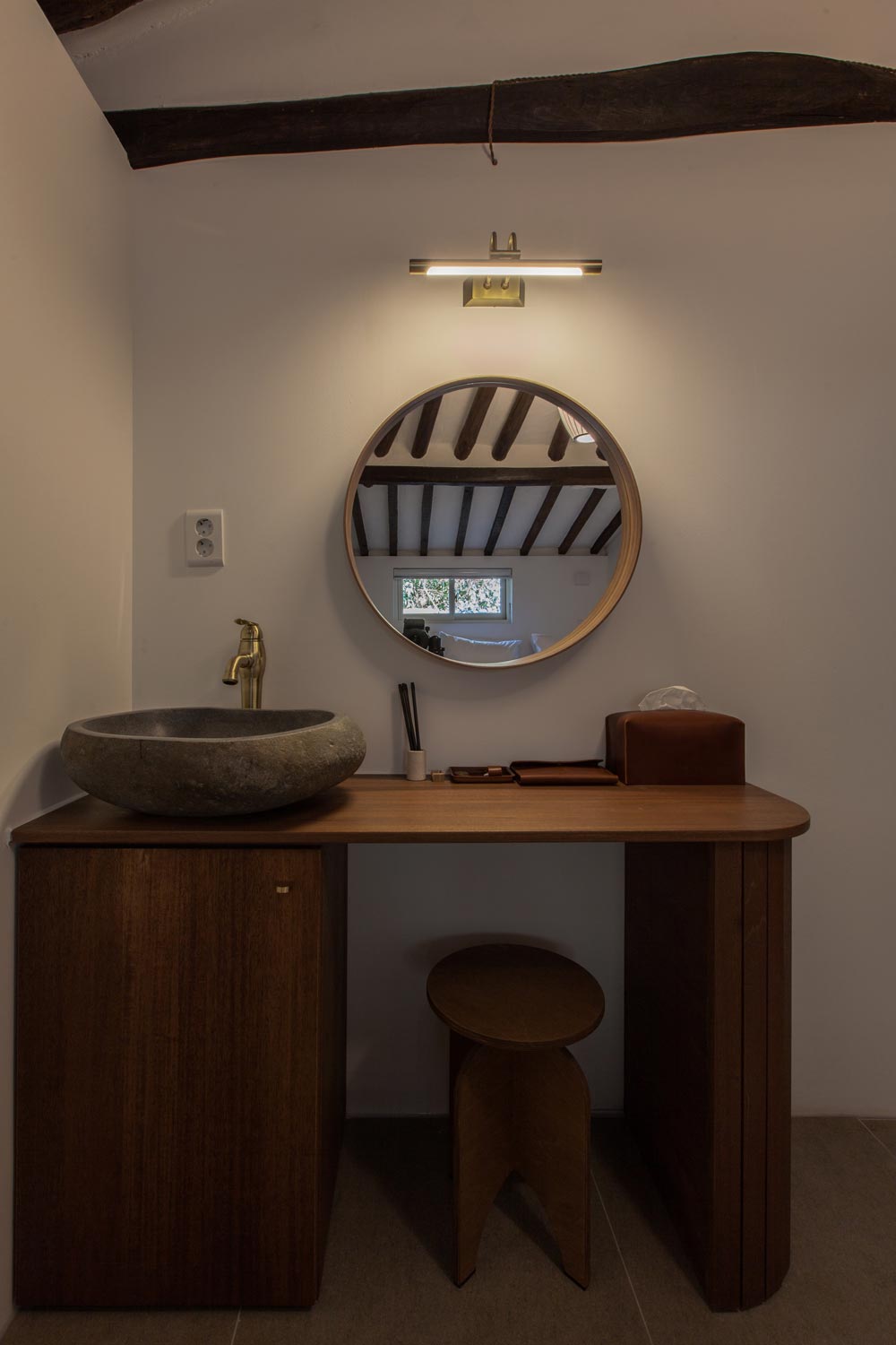 무렵의 리노베이션 프로젝트는 오래된 한옥에 계획 없이 덧붙여 있던 부분들을 하나하나 지워나가 기존의 아름다운 한옥 베이스 부분을 살려내고 기능적인 부분들을 보강하며 진행했습니다. 전체적으로 짙은 브라운 컬러와 화이트 그리고 그레이 컬러의 포세린 타일을 활용하여 깔끔하면서도 무게감 있고 고급스러움을 주었습니다. 보통의 한옥 호텔이나 게스트하우스들은 방 한 칸을 사용하기 마련이지만 무렵 같은 경우 한옥 전체를 프리미엄 한옥 호텔 스타일로 사용할 수 있는 장점이 있습니다. 거실의 중간중간 기둥의 하단부에는 화강석으로 둘러 조금 더 묵직하고 고급스러움을 느낄 수 있도록 하였습니다.