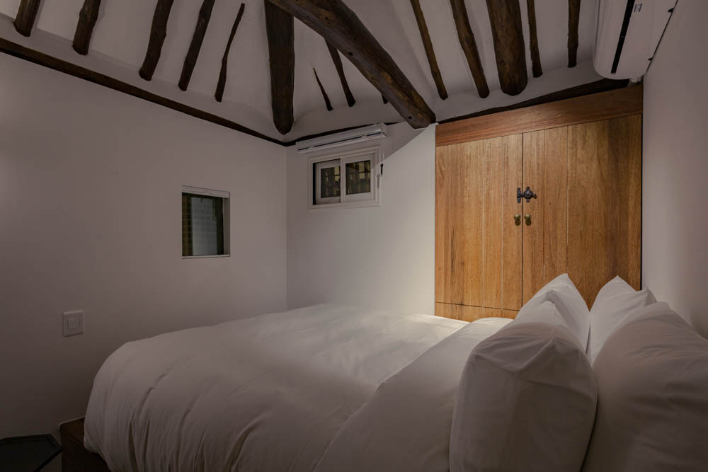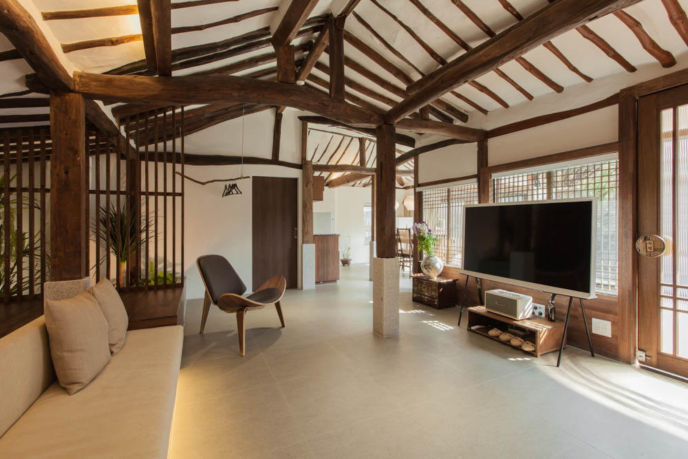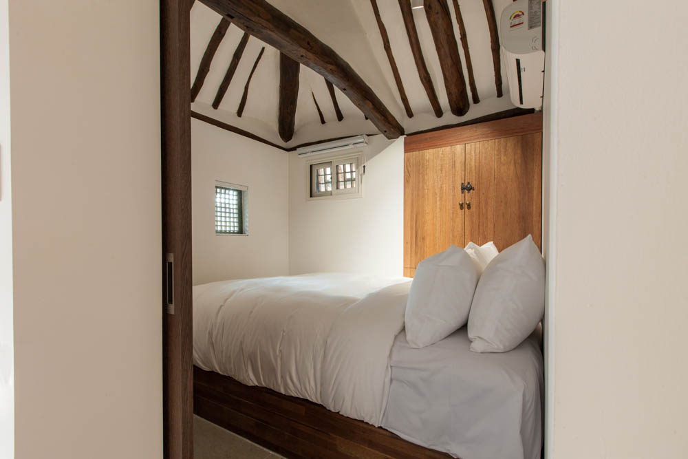 The renovation project of Mooryeob was carried out by removing one by one the parts that had been added to the old hanok without a plan, revitalizing the existing beautiful hanok base area and reinforcing the functional parts. Overall, a dark brown color was used with white and gray porcelain tiles for a neat yet grave and luxurious feeling. Generally, hanok hotels and guesthouses tend to use one room, but Mooryeob’s merit is that the entire hanok can be used as a premium hanok hotel style. The lower part of the pillars in the middle of the living room was covered with granite to give it a slightly weighty and luxurious feel.