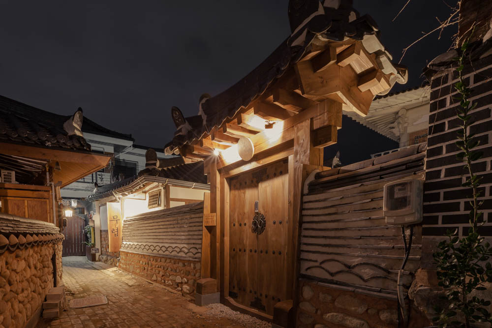 ‘Mooryeob’ has a total of two rooms. Both were made with sliding doors to secure space, and when one lies down under the rafters, they can feel as if they are living in a day from 50 years ago. In the first room, a circular window was placed so that the small space doesn't seem stifling. The second room is a relatively spacious room, and a powder room where one can briefly freshen up was provided. Next is the bathroom. One can enjoy relaxing in the bathtube while looking at the red clay wall. Next is the exterior. We aimed to recreate the hanok's appearance from 50 years ago, and the yard was made to able to feel a feeling of luxury and the beauty of moderation with the pine trees and water space. With Hanok stay Mooryeob, we wanted to show a hanok stay that has a luxury and deep lines, rather than an adorable appearance. The premium hanok stay is shown from the exterior wall and front gate, and the fixed stepping stones, pine trees and reflective water space that can be seen when opening the gate enhance the luxury. What would the atmosphere be like at night when the lights are on? The exterior's atmosphere is truly beautiful. The appearance of Mooryeob at night in the hanok village, where the splendid lights of tbe city are absent, is indeed gorgeous. The perfect black and the reflecting lights present a magnificent sight. The various beauties of Mooryeob can be felt depending on the season and the weather.