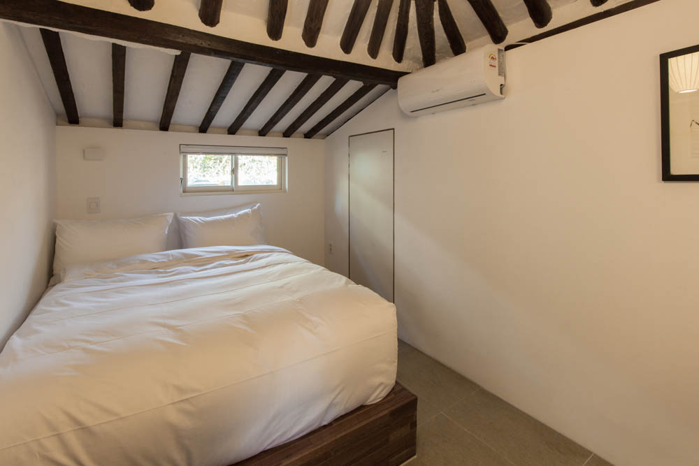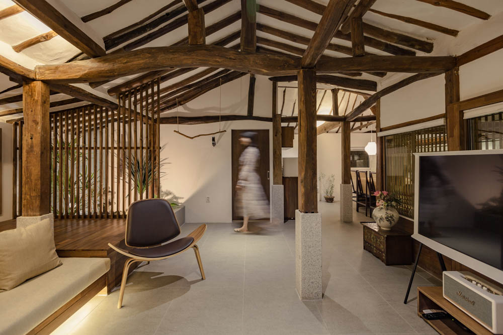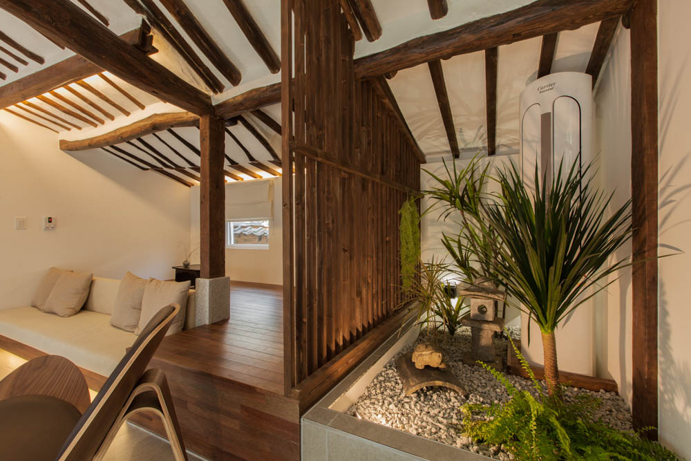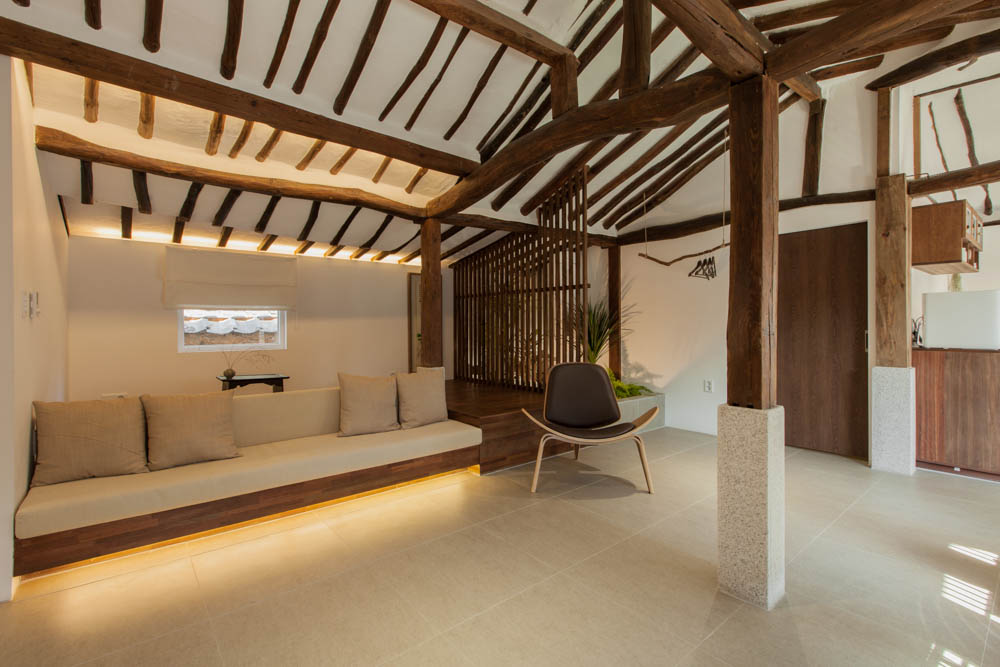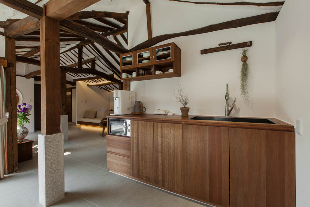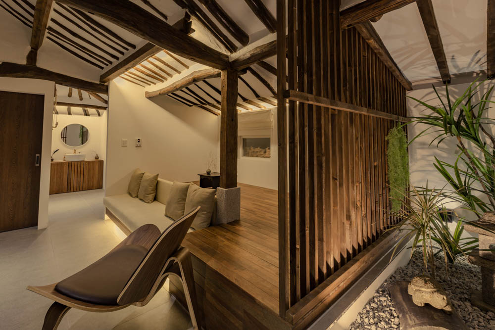 The renovation project of Mooryeob was carried out by removing one by one the parts that had been added to the old hanok without a plan, revitalizing the existing beautiful hanok base area and reinforcing the functional parts. Overall, a dark brown color was used with white and gray porcelain tiles for a neat yet grave and luxurious feeling. Generally, hanok hotels and guesthouses tend to use one room, but Mooryeob’s merit is that the entire hanok can be used as a premium hanok hotel style. The lower part of the pillars in the middle of the living room was covered with granite to give it a slightly weighty and luxurious feel.