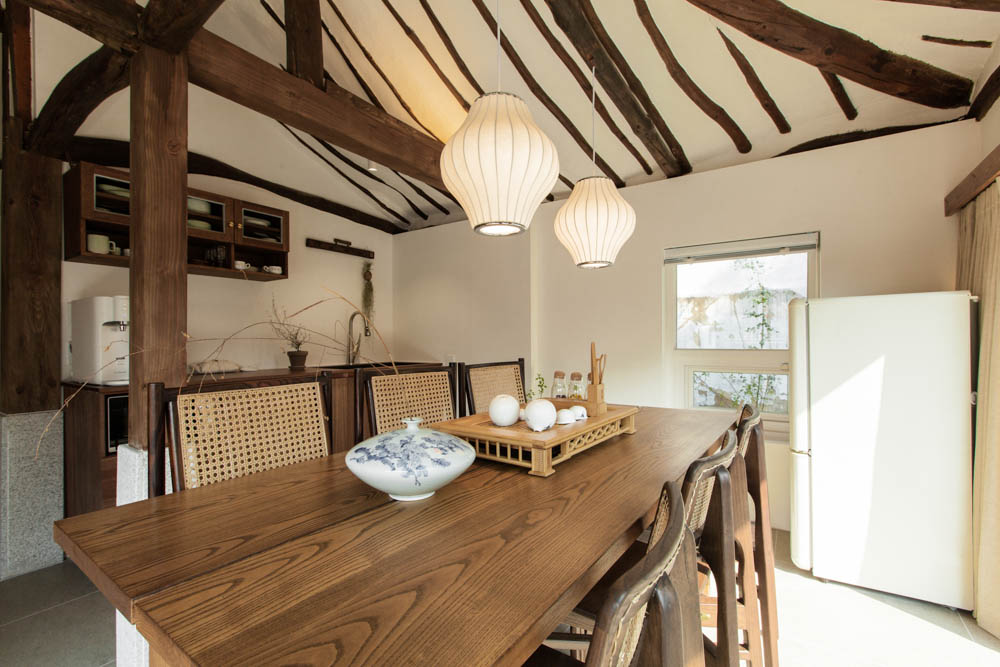 The living room also has a low wooden bench as well as an interior garden. Although the standing lifestyle is the basic, there is a low wooden bench where one can experience a sitting lifestyle of a hanok. The indoor garden that continues from the outside yard breathes life into the neat space. Next is the kitchen interior. The kitchen is the main point in the Mooryeob project. The part that protrudes from the L-shaped structure is the kitchen, and it was finished with glass for transparency and openness. The lower part of the exterior was made as a water space. Here, the feeling of the kitchen seeming as if it is floating on water, and the kitchen reflected in the water. Inside the kitchen, a dark-colored table and sink were made to maintain the luxurious atmosphere. Since the dining room has two of its sides made of glass, one can enjoy food or a cup of tea while admiring the scenery outside. The low wooden bench at the back of the living room is a space where the traditional sitting lifestyle can be experienced, and the hanok can be experienced while looking at the red clay wall through the small window.