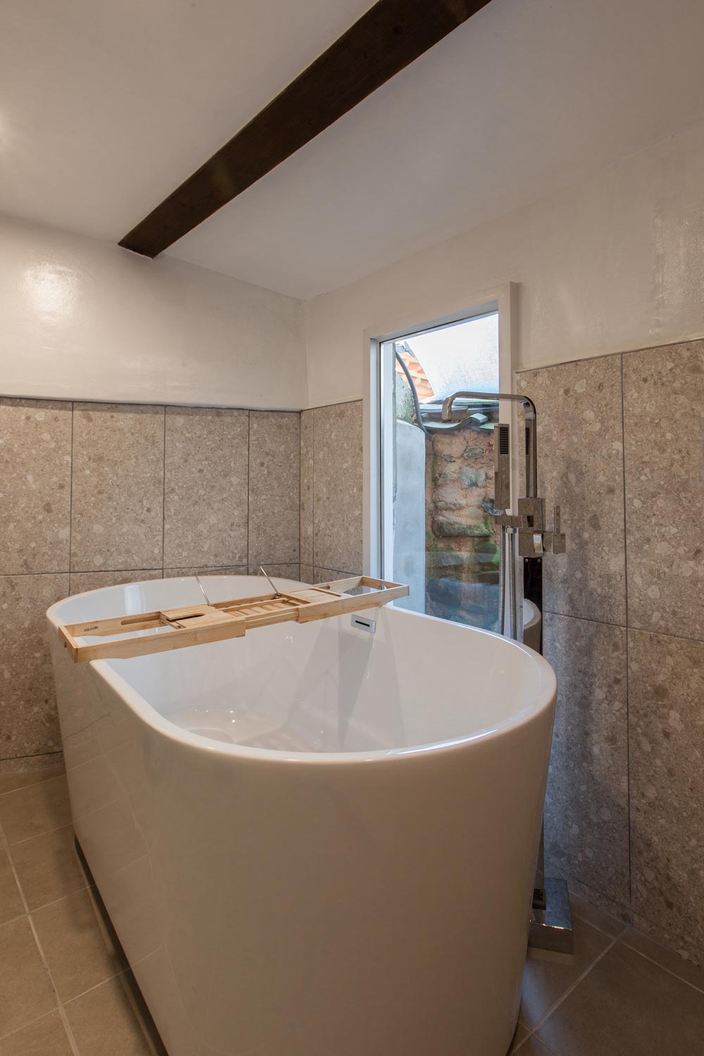 무렵의 리노베이션 프로젝트는 오래된 한옥에 계획 없이 덧붙여 있던 부분들을 하나하나 지워나가 기존의 아름다운 한옥 베이스 부분을 살려내고 기능적인 부분들을 보강하며 진행했습니다. 전체적으로 짙은 브라운 컬러와 화이트 그리고 그레이 컬러의 포세린 타일을 활용하여 깔끔하면서도 무게감 있고 고급스러움을 주었습니다. 보통의 한옥 호텔이나 게스트하우스들은 방 한 칸을 사용하기 마련이지만 무렵 같은 경우 한옥 전체를 프리미엄 한옥 호텔 스타일로 사용할 수 있는 장점이 있습니다. 거실의 중간중간 기둥의 하단부에는 화강석으로 둘러 조금 더 묵직하고 고급스러움을 느낄 수 있도록 하였습니다.