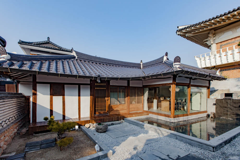 When the weather is warm, we think that the wooden porch will become a time traveling space where one can sit on and take some time to look back on the past or cool their head. What would the interior be like at night? The subtle and warm lights brighten up the interior. In the dining space at night, the light is reflected on the glass and the atmosphere reflected in the water space creates a truly elegant space. That was the interior of Jeonju Hanok stay Mooryeob. Mooryeob, which aims to be a premium hanok stay overall. We wanted to propose a hanok stay where the entire hanok building can be used, while maintaining the quality of the hotel. In particular, it was a project where we gave a lot of thought for when 4 or more visitors use the hanok, rather than 1~2 people.