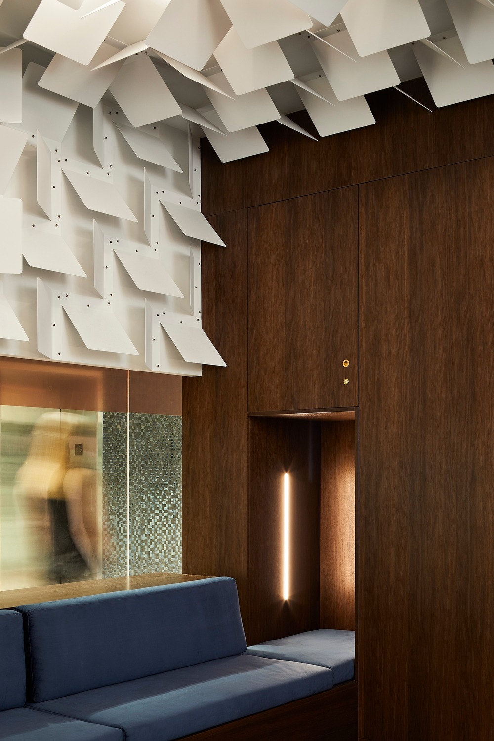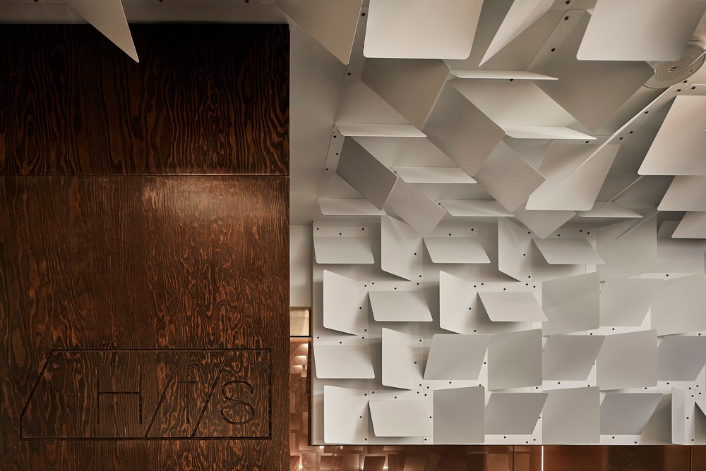 짙은 훈제 오크 목공 및 헤링본 바닥, 감각적인 벨벳 실내 장식, 부드러운 호박색 조명 및 녹청색 황동 부속품이 어둡고 차분한 분위기를 만들어 조용하고 변덕스러운 분위기를 연출한다. 대조적으로, 255개의 분말 코팅된 접힌 금속 패널은 765개의 녹청색 황동 나사로 고정되어 천장과 벽을 감싸고 강렬하고 감싸는 오디오 경험을 모방하는 공간적으로 다이내믹한 몰입형 공간을 만들어 준다. 어떤 의미에서 금속 패널은 공격적이지만 스케일과 반복은 미묘한 움직임과 흐름을 만들어낸다. 강인함과 부드러움 사이의 병치는 몸에 느껴지는 감정적인 톤의 구성을 만들어낸다.