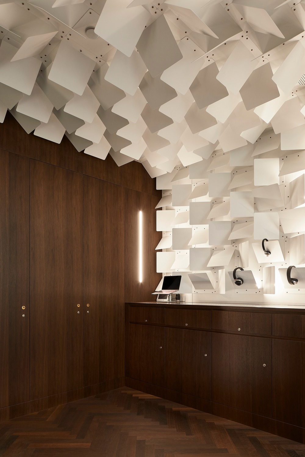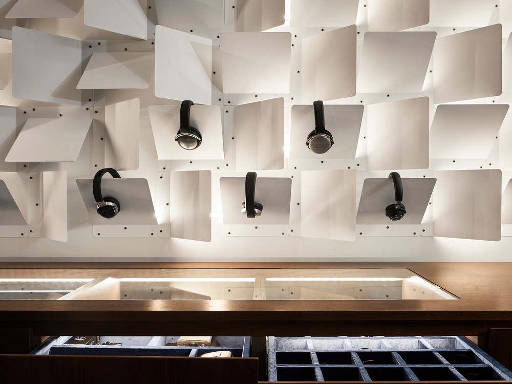 디자인은 고객이 느끼는 방식에 영향을 미치기 위해 노력하는 동시에 환경을 최적화할 수 있는 방법에 대해서도 재고한다. 제품 전시 시스템은 건축과 별개의 요소가 아니라 사물과 건축의 경계를 허물고 있다.  헤드폰 스탠드는 방문객의 상단을 넘어 반대편 벽을 따라 확장되어 디스플레이 자체에 감싸는 벽의 디스플레이로 재창조되었다. 구부러진 금속 패널은 헤드폰을 여러 가지 구성으로 디스플레이할 수 있으며 보기 흉한 와이어를 숨길 수 있다.