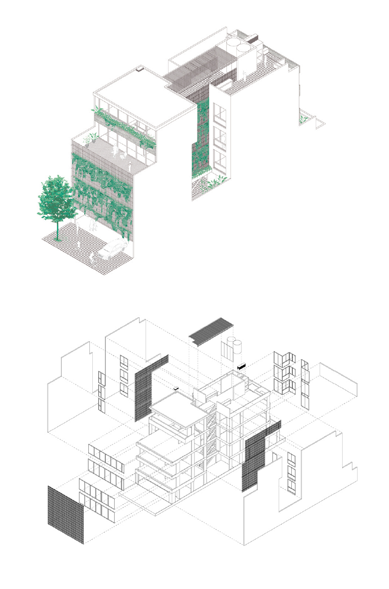 The built mass is interrupted, giving rise to the circulatory system as an articulator of intermediate spaces, in search of situations and encounters challenging new spatial possibilities. This articulating space is filtered by a metallic skin that allows the growth of vegetation on both sides.